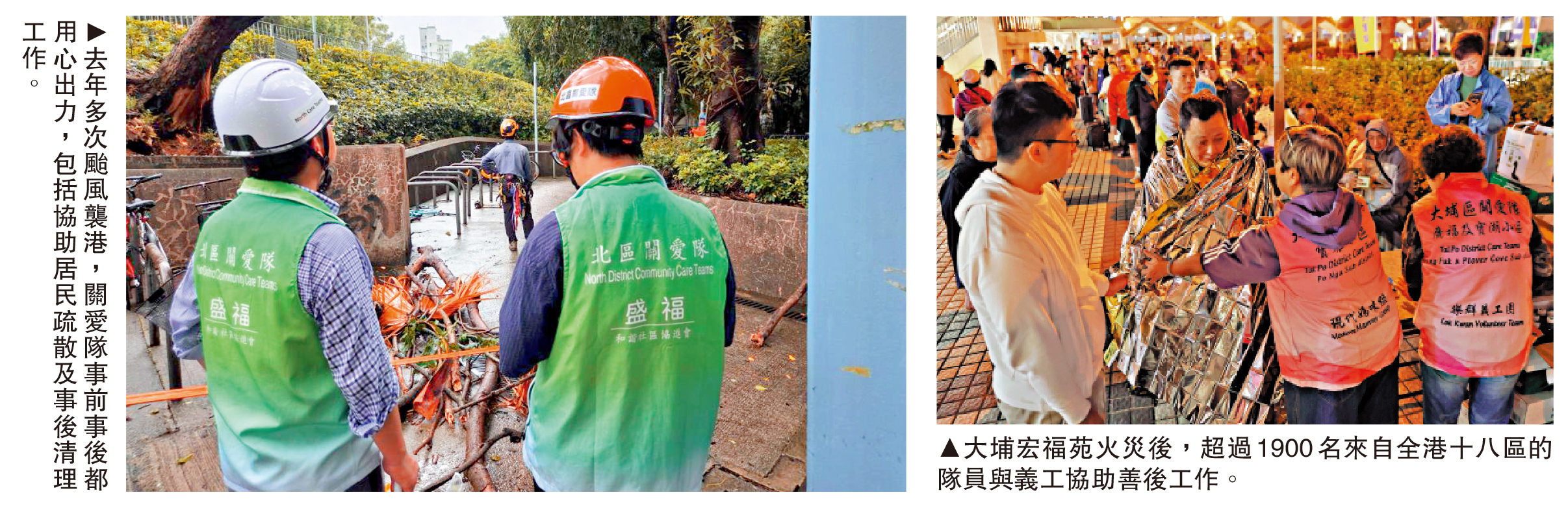 環保南關愛隊副隊長、西貢區議員張美雄向大公報記者表示,關愛隊在凝聚社區人心、發掘獨居及隱蔽長者,以及應對突發災情等方面成果顯著,惠及大量家庭。他舉例自身所在的環保南關愛隊多項事例:去年六月,區內大型屋苑清水灣半島停食水時,關愛隊即時幫忙撲樽裝水及協助;去年九月十號風球樺加沙襲港期間,將軍澳災情嚴重,海濱長廊散落大量雜物沙石,民政事務處隨即召集關愛隊協助幫忙清理。他說,以上種種事件均反映出,在應對突發事件時,關愛隊能迅速動員義工隊伍,形成一呼百應的局面,有效穩定社區發展。他又引述報告指出,政府撥款4.11億元資助第一期關愛隊,認為所產生的社會效益遠超投資數倍,難以用金錢衡量。\大公報記者 王蕙如、龔學鳴