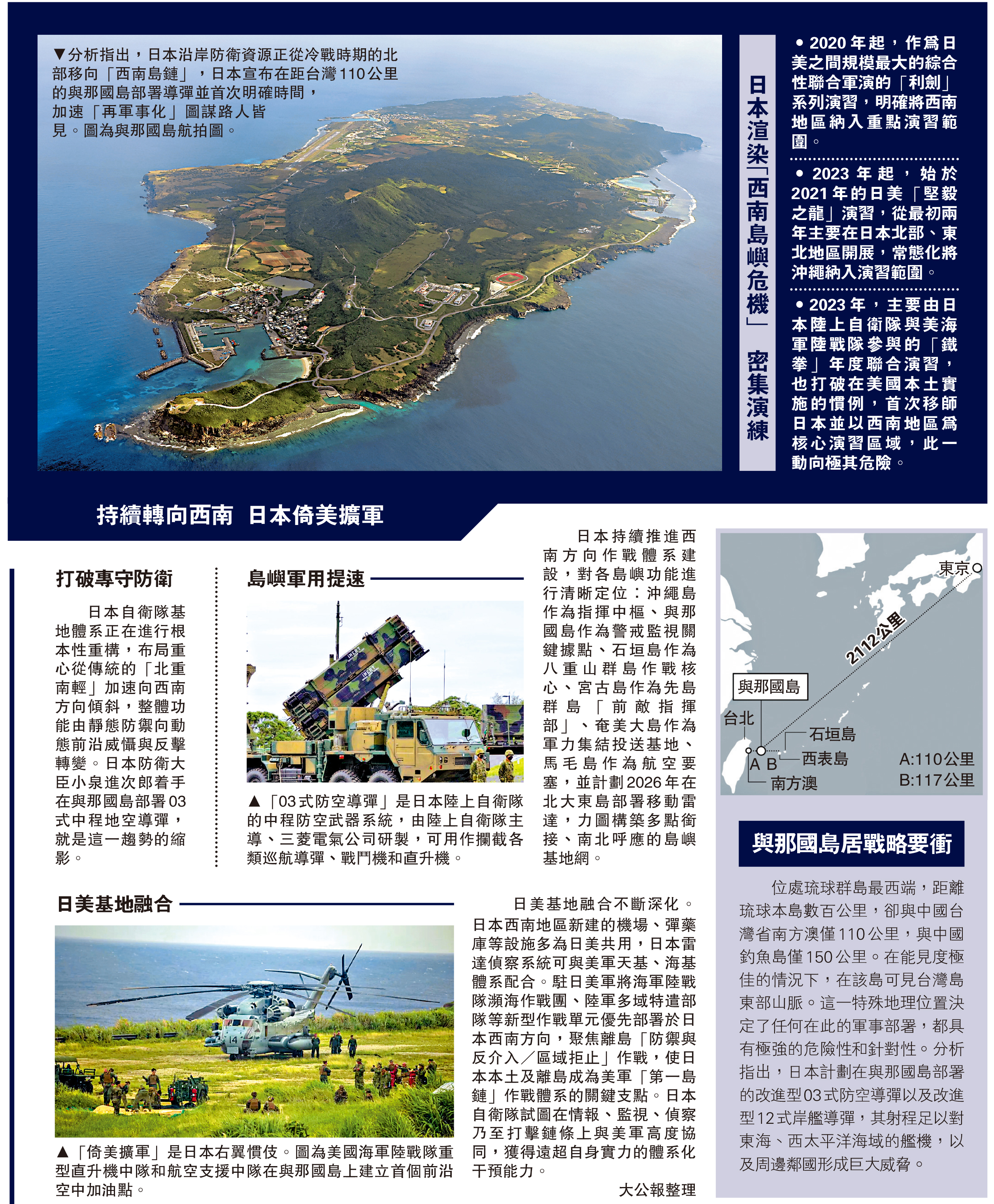 【大公報訊】綜合環球時報、新華日報報道:綜合日媒報道,日本防衛相小泉進次郎2月24日在記者會上宣布,計劃於2030財年(2030年4月1日至2031年3月31日)在與那國島部署陸上自衛隊防空導彈,具體而言,將組建配備03式中程防空導彈的部隊。日媒報道稱,日方此舉意在針對所謂「台灣有事」等情況強化防衛能力,與妄言「台灣有事,日本有事」的高市早苗沆瀣一氣。
