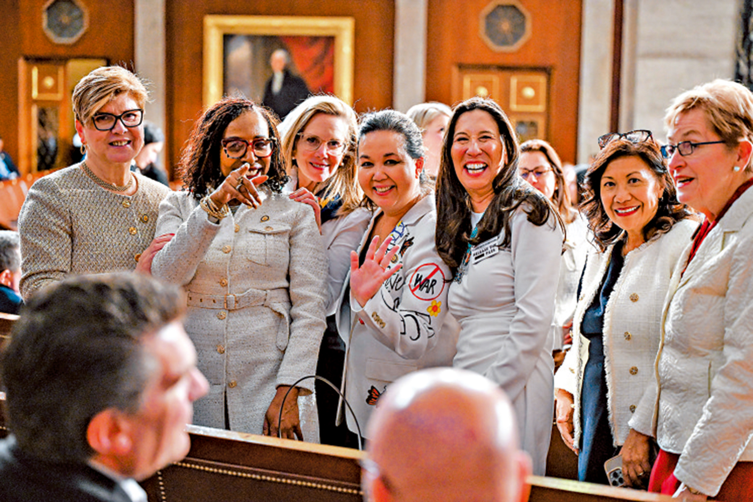 多名民主黨女議員24日身穿全白套裝,佩戴與愛潑斯坦案相關的徽章,出席國情咨文演說。有的徽章印有「公布檔案」標語,以及象徵已故愛潑斯坦案受害者朱弗里的蝴蝶圖案,其中一款白色徽章則在「檔案」字樣前加上一個黑色方塊,代表司法部公布的文件被塗黑遮擋。