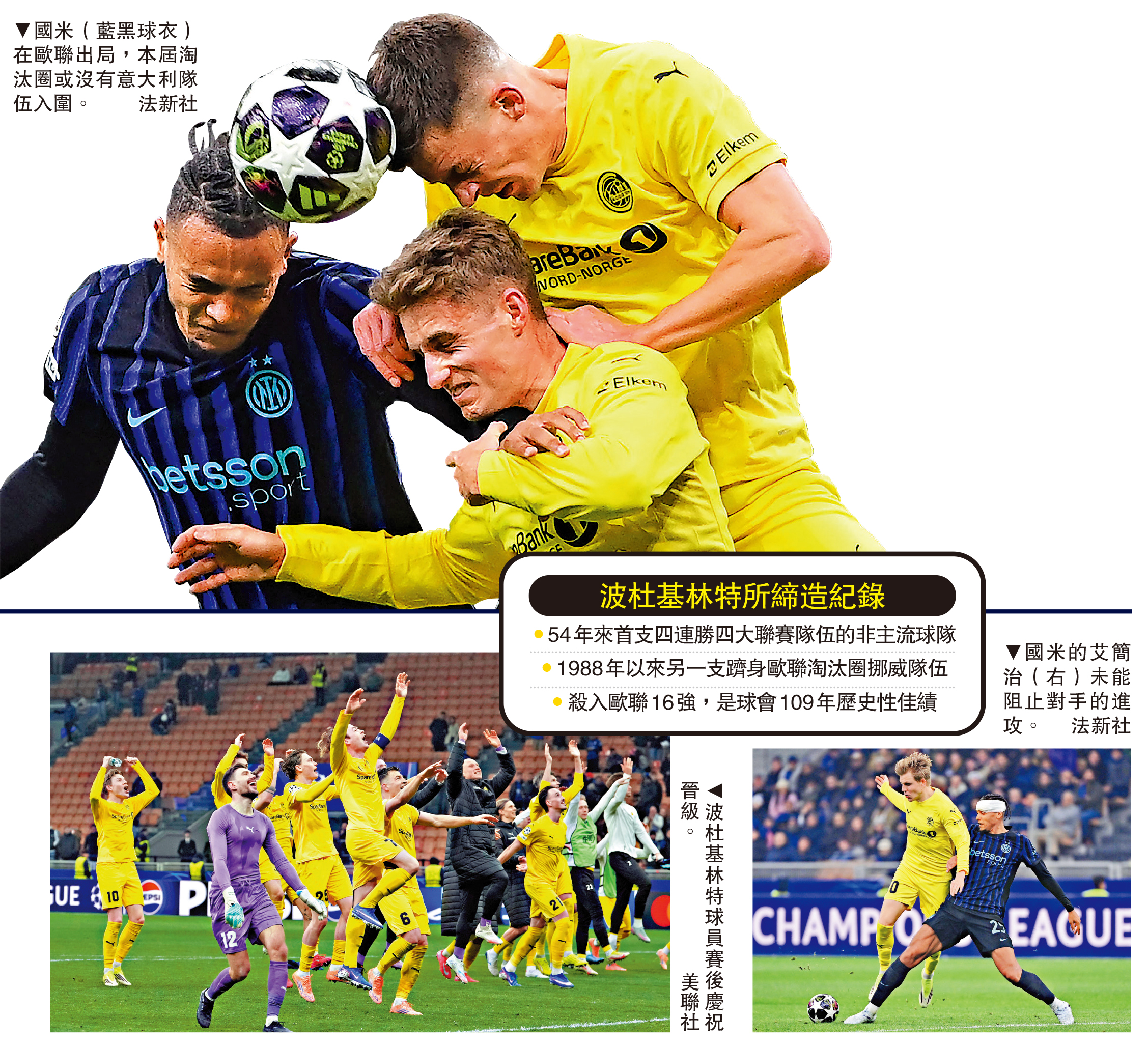 歐聯附加賽次回合25日開打,首回合領先兩球的挪威「奇兵」波杜基林特,作客再鬥國際米蘭,結果順利再贏2:1之下,兩回合計以5:2雙殺國米,不僅創會109年來首次打入歐聯16強,更成為逾50年來首支連續4場歐聯擊敗歐洲5大聯賽球隊的「非5大」球隊。這支意甲榜首被擯出本屆賽事後,連同早於聯賽階段出局的拿玻里,加上阿特蘭大及祖雲達斯於首回合落後,4支意甲球隊隨時全數無緣16強。\大公報記者 梁潤森