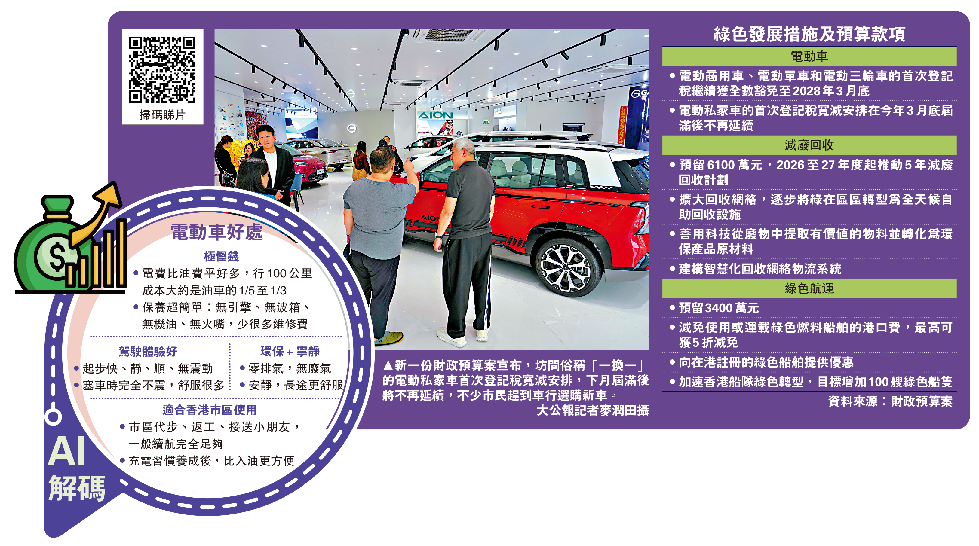 新一份財政預算案宣布,俗稱「一換一」的電動私家車首次登記稅寬減安排,下月屆滿後將不再延續,但商用電動車首次登記稅全數豁免至2028年3月底。政府消息人士表示,隨着本港各項電動私家車的條件趨成熟,如車款、車價、汽車性能、充電價比油費低等,認為現時是時候結束相關寬減。