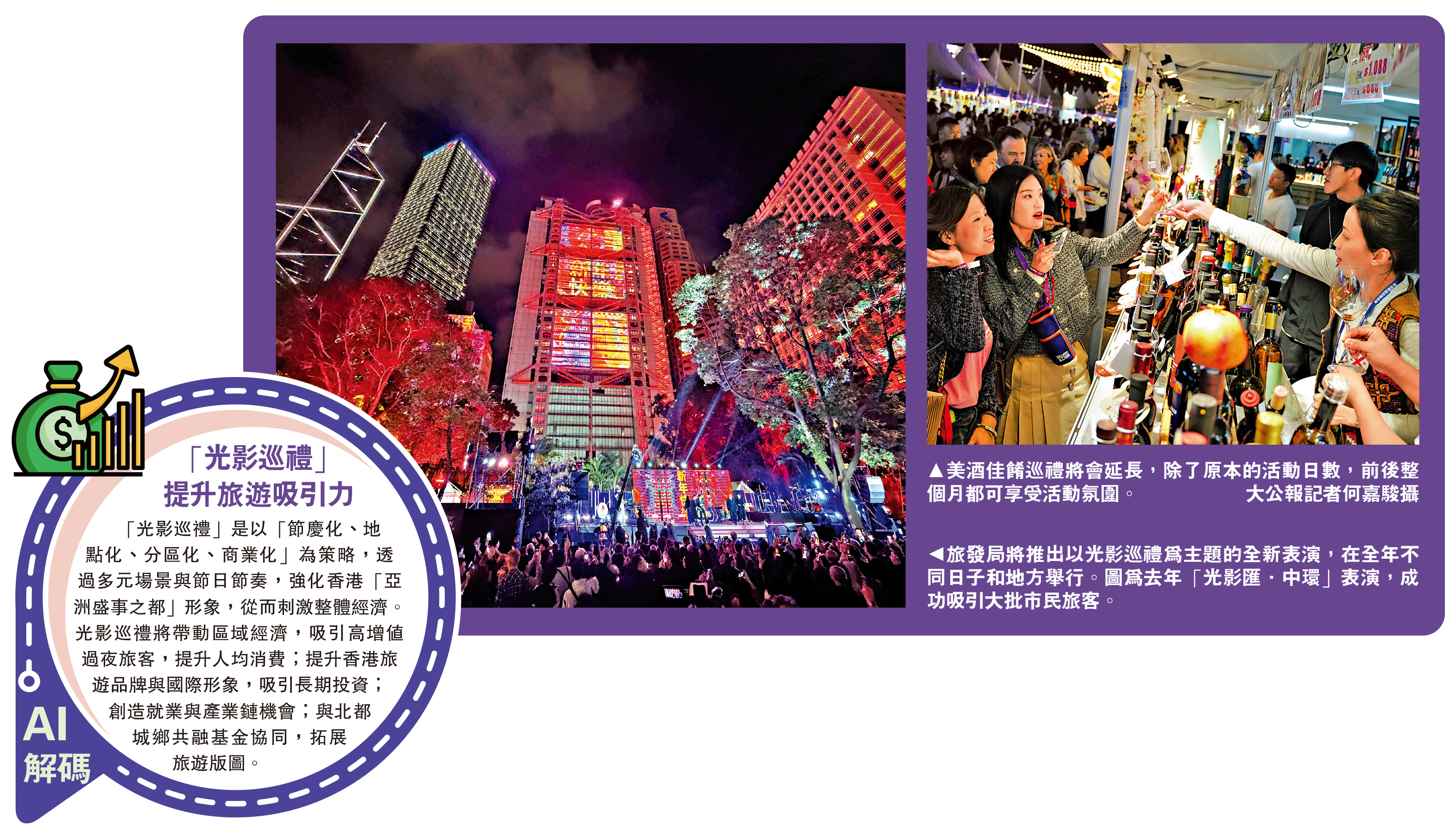 特區政府新一份預算案加大力度推動旅遊發展,向香港旅遊發展局撥款加碼至16.6億元,希望今年吸引5380萬名訪港旅客,較去年增7.8%。為提升旅遊吸引力,旅發局將加大旗艦活動規模,並引入新亮點,將推出全新「光影巡禮」表演,取代有22年歷史的「幻彩詠香江」,預計於全年不同節慶時在中環、尖沙咀等不同地點上演,參考去年的「光影匯·中環」模式,為附近商戶帶來夜市生意。有旅客期待,在其他區舉辦光影表演將更加精彩。