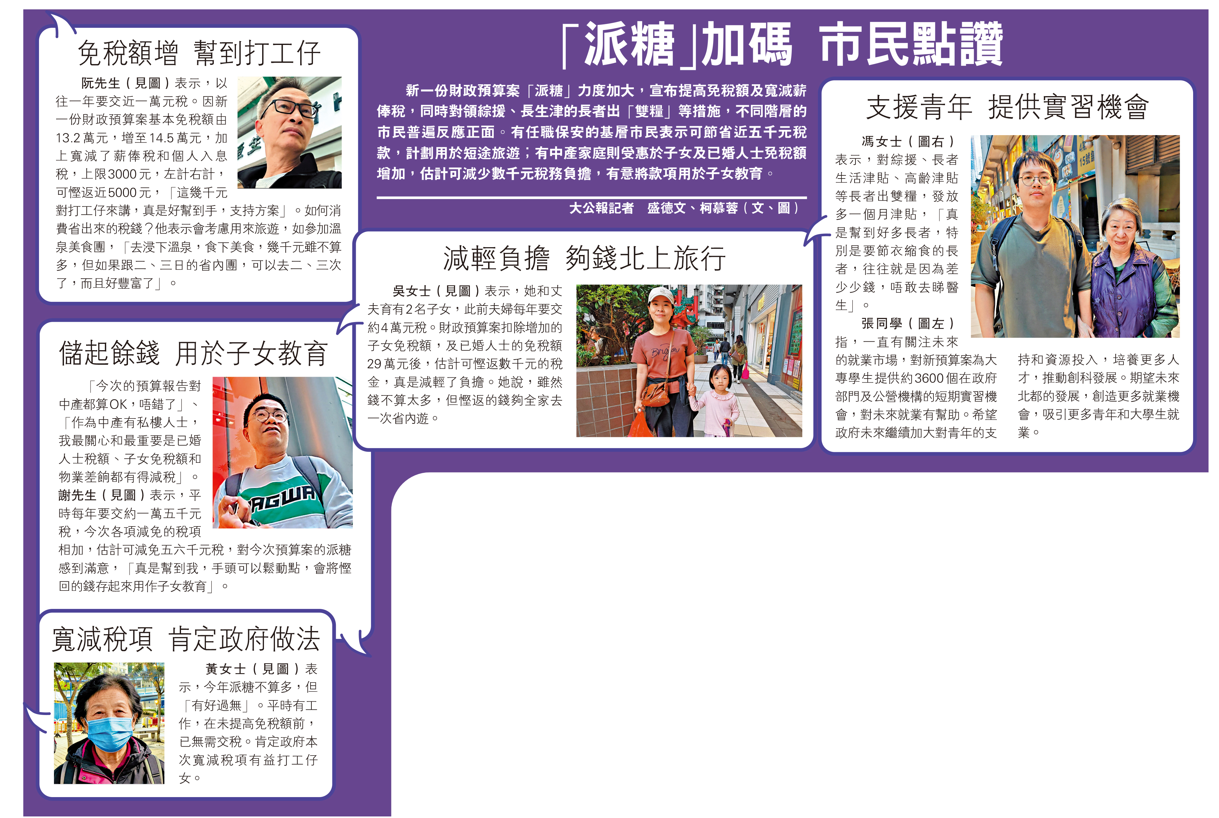新一份財政預算案「派糖」力度加大,宣布提高免稅額及寬減薪俸稅,同時對領綜援、長生津的長者出「雙糧」等措施,不同階層的市民普遍反應正面。有任職保安的基層市民表示可節省近五千元稅款,計劃用於短途旅遊;有中產家庭則受惠於子女及已婚人士免稅額增加,估計可減少數千元稅務負擔,有意將款項用於子女教育。\大公報記者 盛德文、柯慕蓉(文、圖)