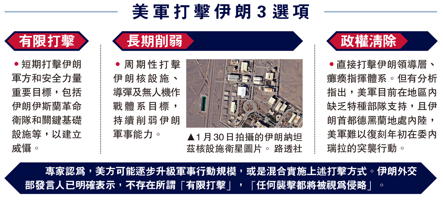 •直接打擊伊朗領導層、癱瘓指揮體系。但有分析指出,美軍目前在地區內缺乏特種部隊支持,且伊朗首都德黑蘭地處內陸,美軍難以復刻年初在委內瑞拉的突襲行動。