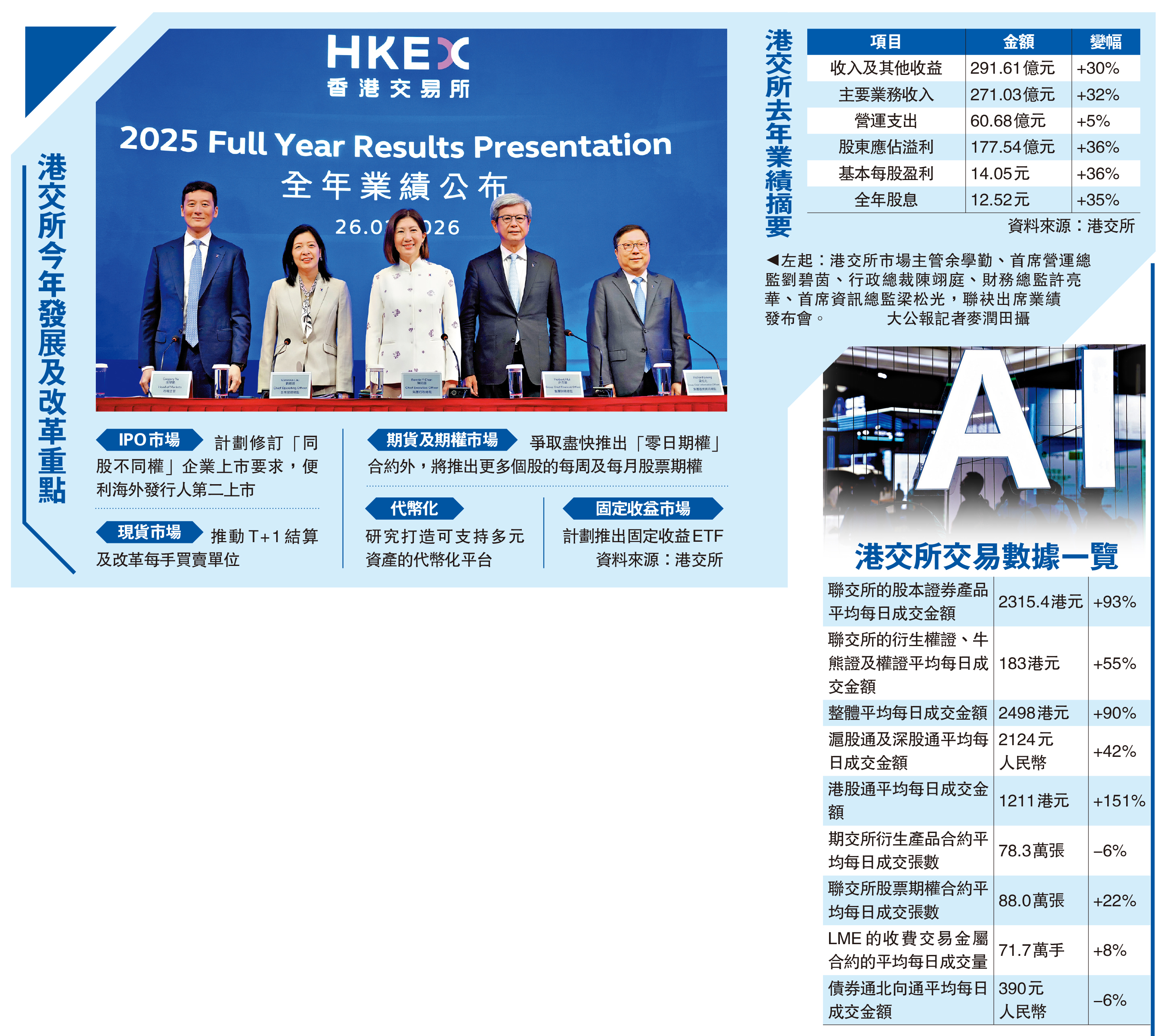 受惠股市交投暢旺,港交所(00388)去年收入291.61億元,增長30%,盈利177.54億元,升36%,兩者連續第二年創新高。行政總裁陳翊庭昨在業績發布會上表示,新一份財政預算案提及不少上市改革內容,但有需要全方位考慮,以提升香港上市競爭力,「同股不同權」、航天科技,均在交易所考慮範圍。