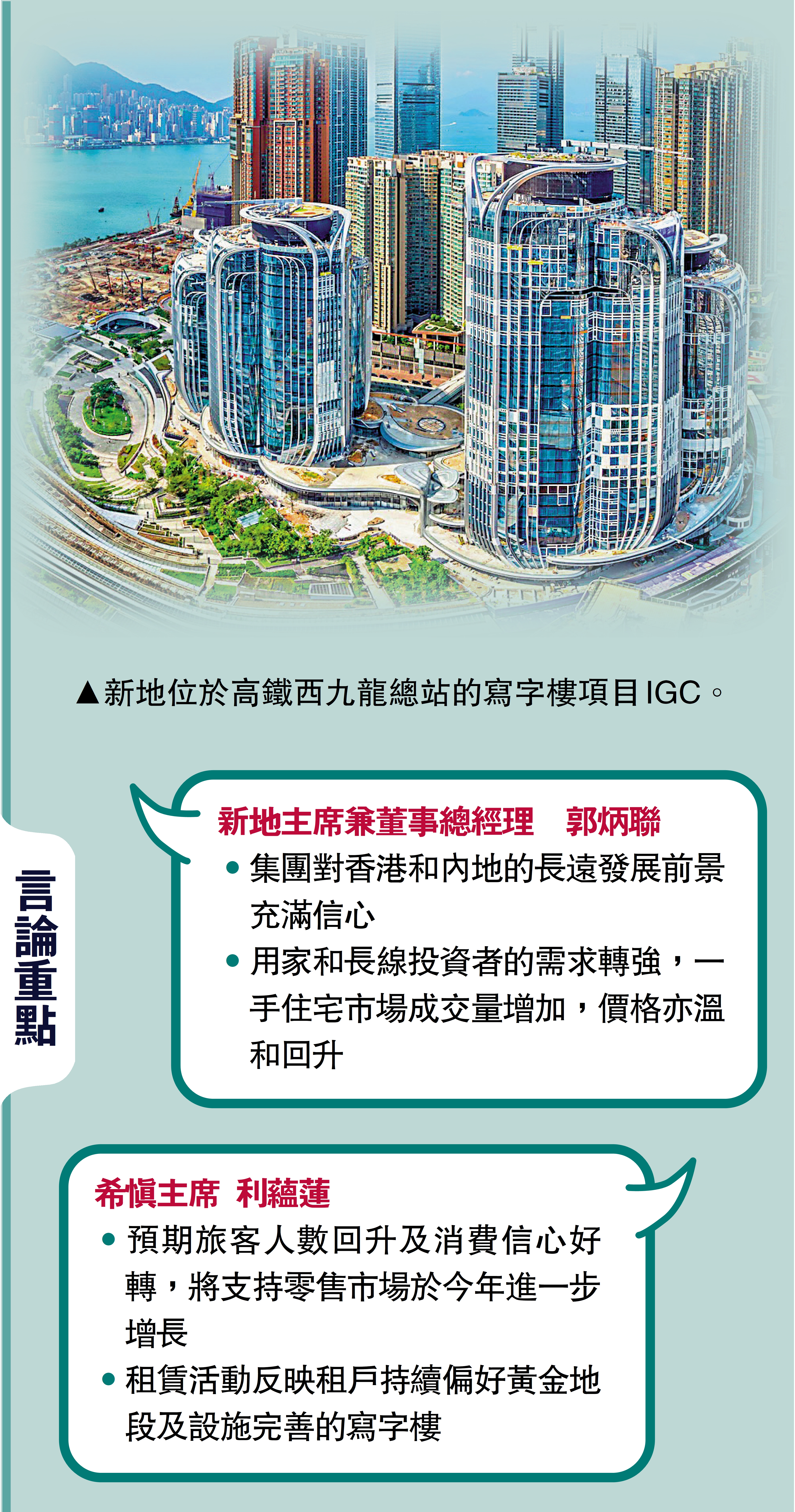 在郭炳聯看來,香港物業租務市況有所改善,在當前升級搬遷的趨勢下,黃金地段的優質物業仍會是租戶的首選,隨着多個項目相繼落成,集團將能滿足相關的市場需求。