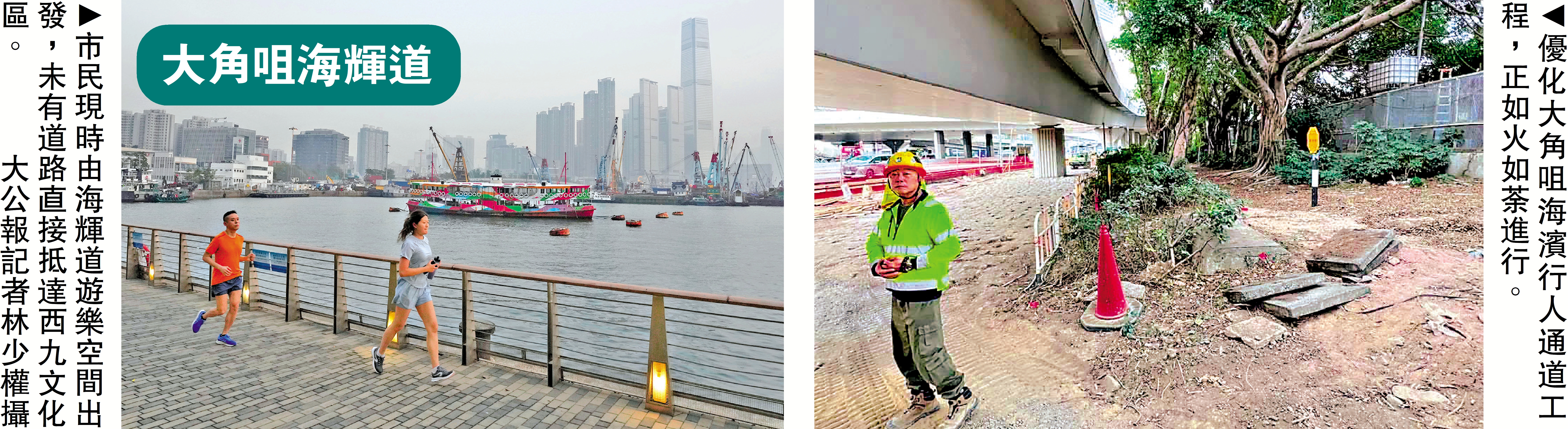 大公報記者早前實測從西九文化區沿海旁前往大角咀,步行一段路後,去到近油麻地貨物裝卸區,有進出限制,行人無法沿海通行,路上可見許多躉船停靠岸邊。自西九延伸出來的行人道至圓方商場對面即已結束,若想繼續通行,只能駕車,但亦不能直接接駁海輝道遊樂空間。
