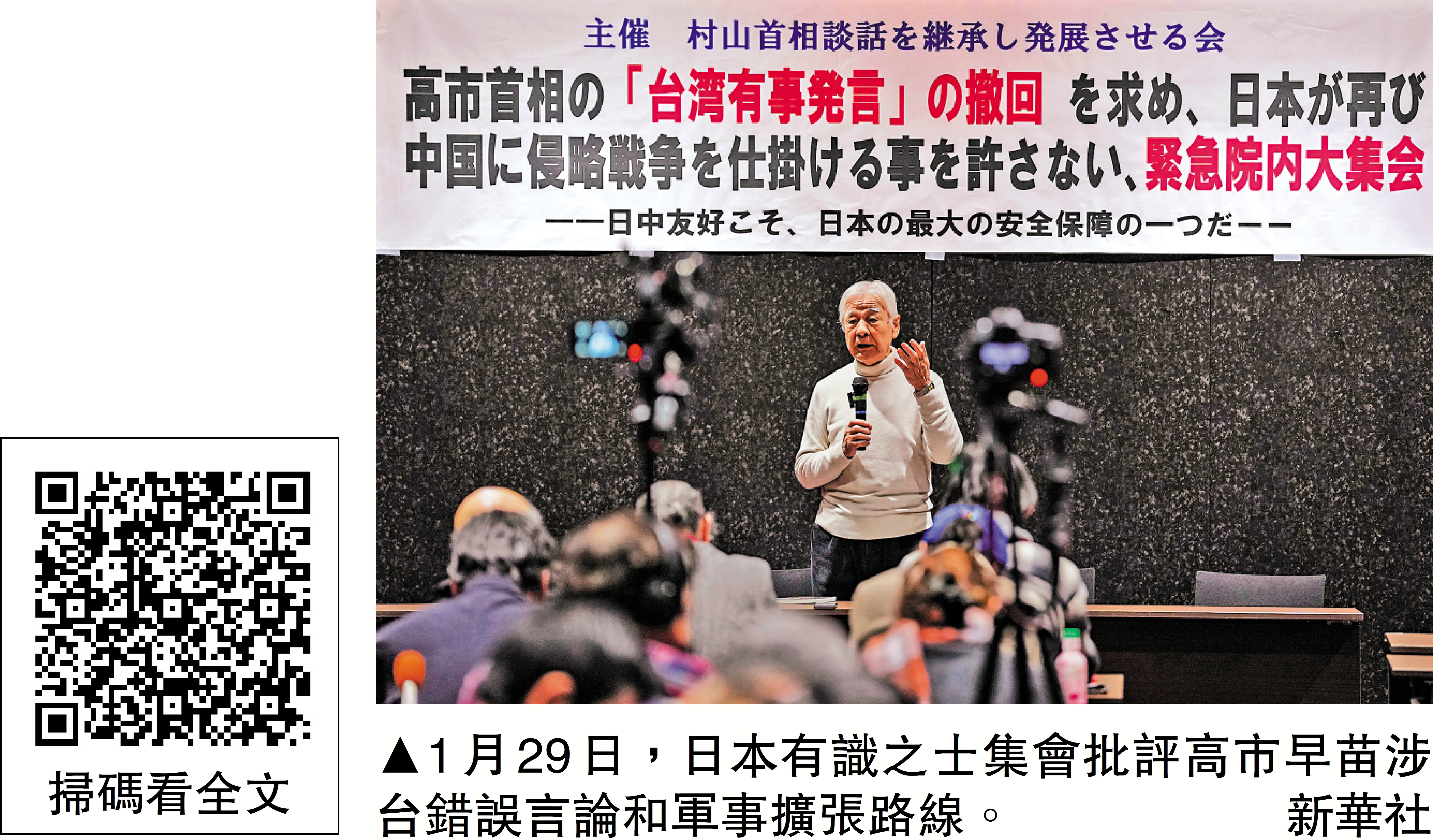 日本眾議院大選前,高市首相再次提及台灣問題,稱日本和台灣離得很近,如果台海發生危機,美日將聯合撤僑,如美軍受攻擊,日本不會坐視不理。我們要問,台灣有事無事,關日本何事?為何執意把日本綁在所謂「台灣有事」的腳本裏?又為何想方設法把美國拉過來說事?她的話,與其說是「反省」,不如說越解釋越吐露了「真心」,暴露出某些勢力不惜代價也要軍事介入台海、干涉中國內政的居心。