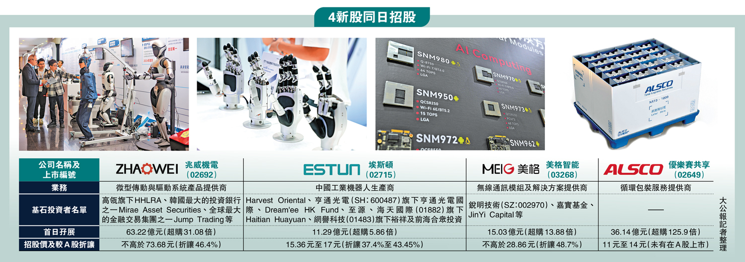 新股市場延續火爆,4新股同日派表招股,合計集資近50億元,當中包括引入7間基投的工業機器人生產商埃斯頓(02715),而微型傳動與驅動系統龍頭企業兆威機電(02692)更獲21間基石投資者認購,當中更不乏海外著名投資機構。