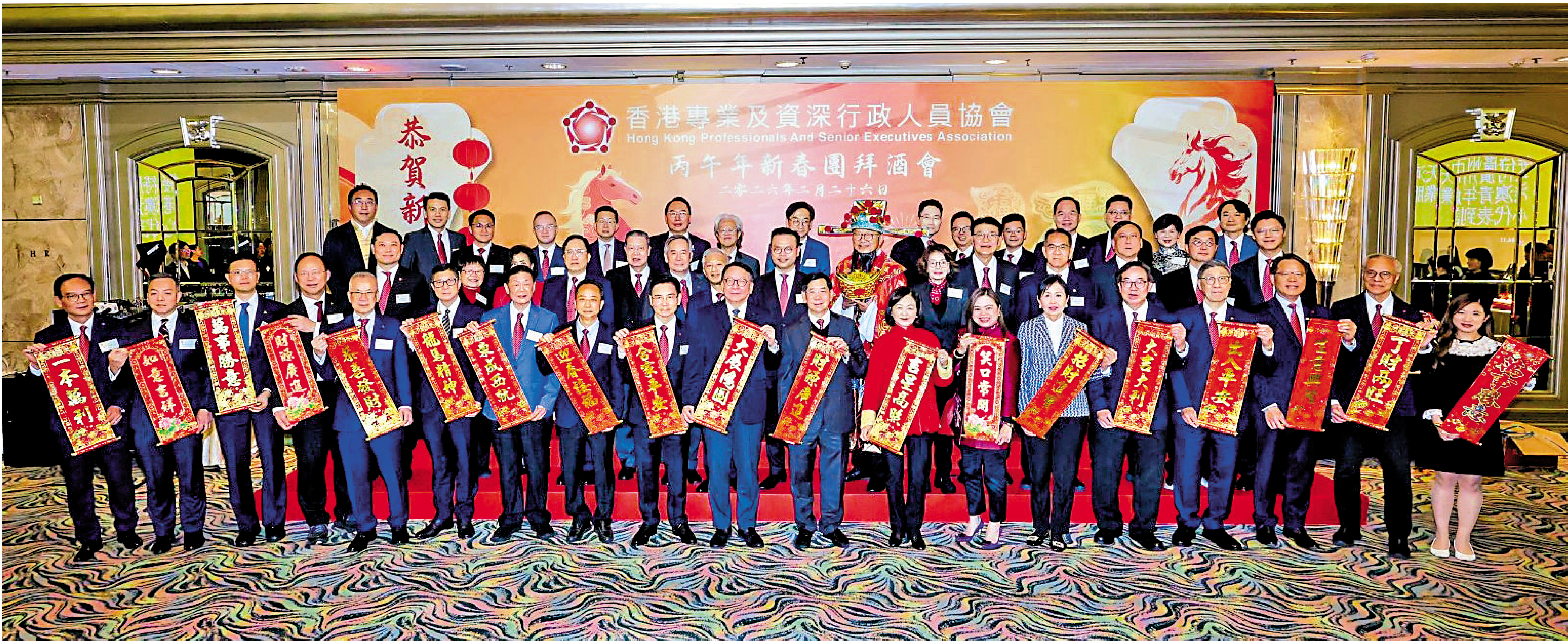 【大公報訊】香港專業及資深行政人員協會日前舉辦新春團拜酒會,政務司司長陳國基及中央政府駐港聯絡辦教育科技部副部長葉水球擔任主禮嘉賓,與一眾嘉賓逾200人同慶新春佳節。協會重視青年發展,在活動上還邀請了10多位參與「專資青年追夢計劃」的年輕人分享參與計劃的得着。