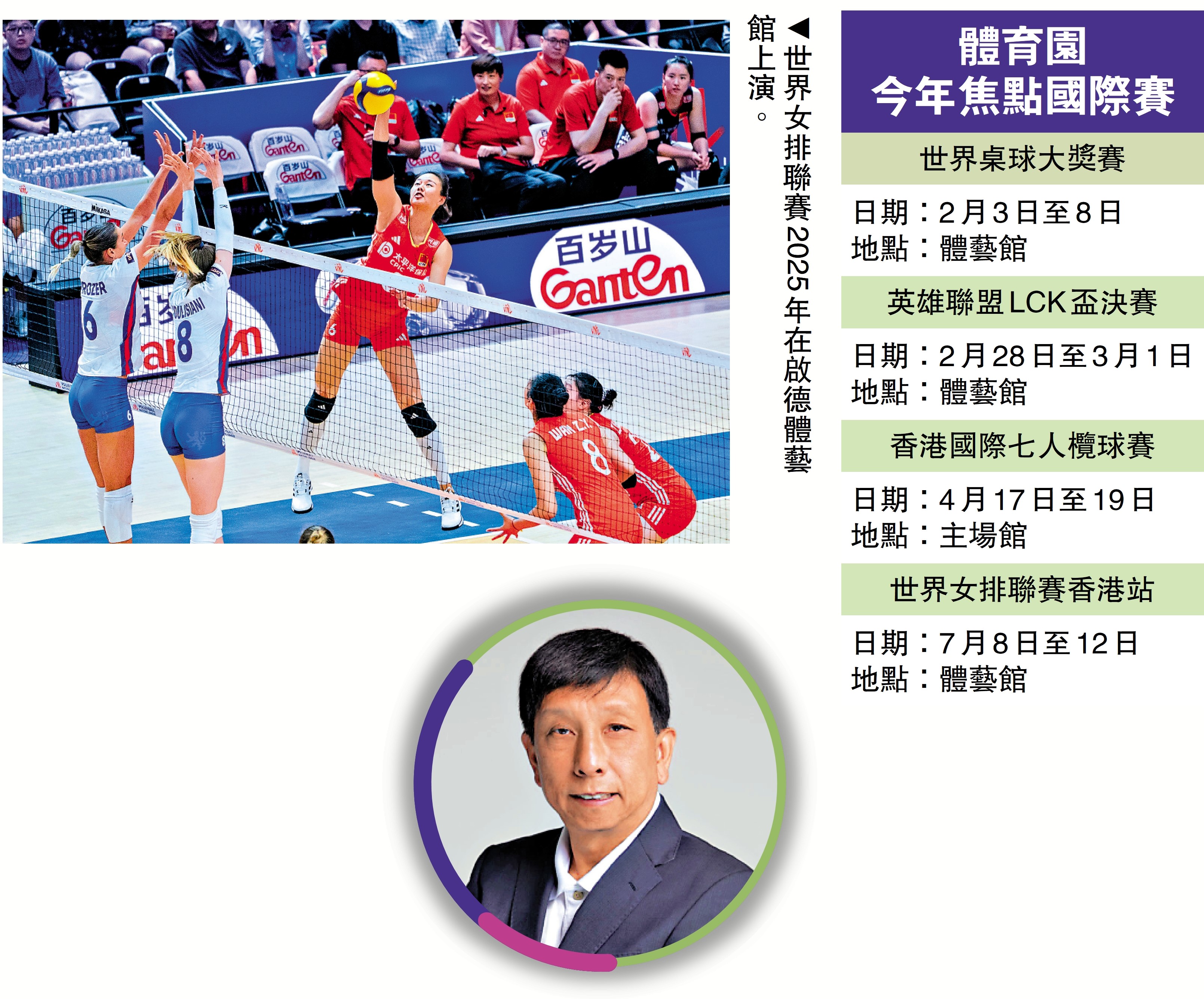 除了人氣火爆的足球盛事、港足比賽外,啟德體育園亦吸引不少賽事首度移師體育園舉行,包括香港國際七人欖球賽、世界女排聯賽等。這些盛事不但獲得各界高度評價,亦將於2026年續在體育園上演,成為香港體育發展的新動力。香港教育大學健康與體育學系高級講師雷雄德(上圓圖)表示,體育園助力推廣本地體育文化,亦將成為亞太地區舉行大型體育盛事的重點市場。