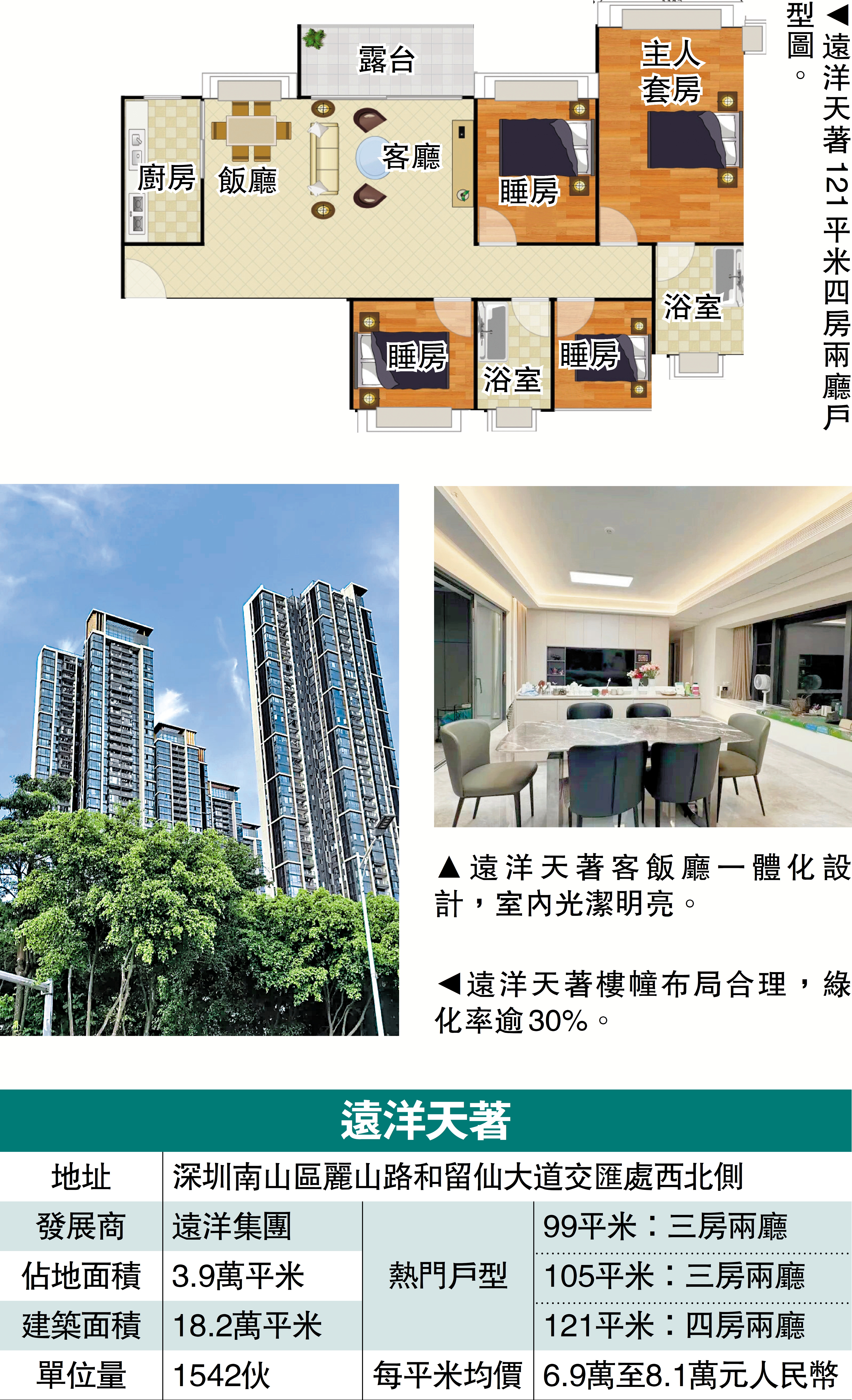 戶型設計上,遠洋天著主力戶型面積99至121平米,間隔由三房至四房,實用率約72%至75%。以99平米三房戶為例,採用豎廳設計,露台開間約3.35米,兩個睡房與客廳朝南,保證了充足的採光。118平米橫廳四房戶,客飯廳一體化設計,開間約6.4至6.5米,布局開闊,全景窗台讓採光與通風效果極佳,部分戶型還望向西麗湖或龍華天際線的美景。目前二手每平米均價介乎6.9萬至8.1萬元人民幣。