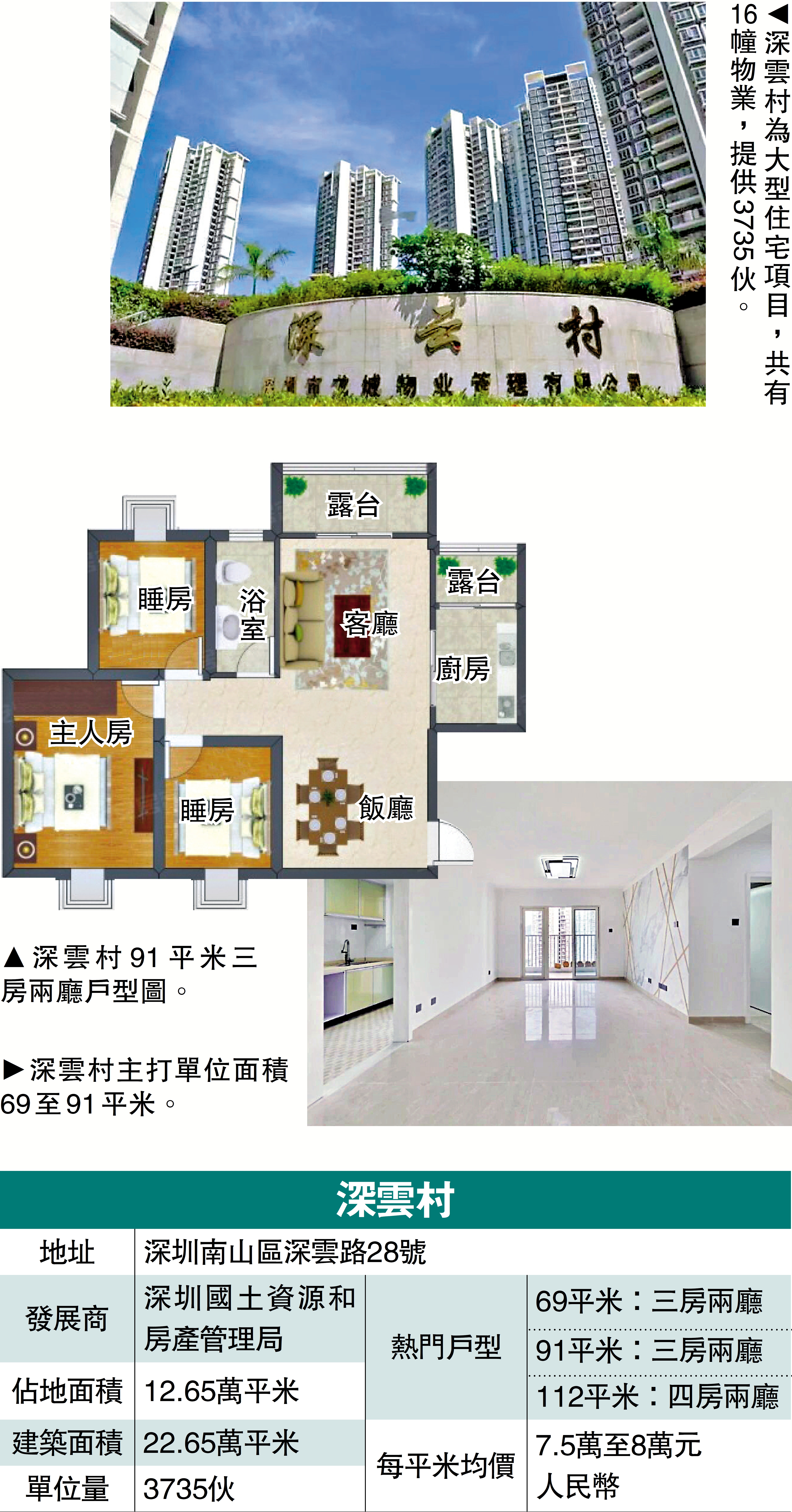深雲村佔地12.65萬平米,總建築面積22.65萬平米,地積比率僅1.8倍,由16幢29至34層高住宅組成,總戶數3735伙。戶型方面,主打單位面積69至91平米,三房兩廳間隔,雙露台、雙睡房朝南格局,布局合理,空間利用率高。另還有112平米雙露台四房戶型,為追求更大居住空間的家庭提供選擇。二手每平米均價由7.5萬至8萬元人民幣。