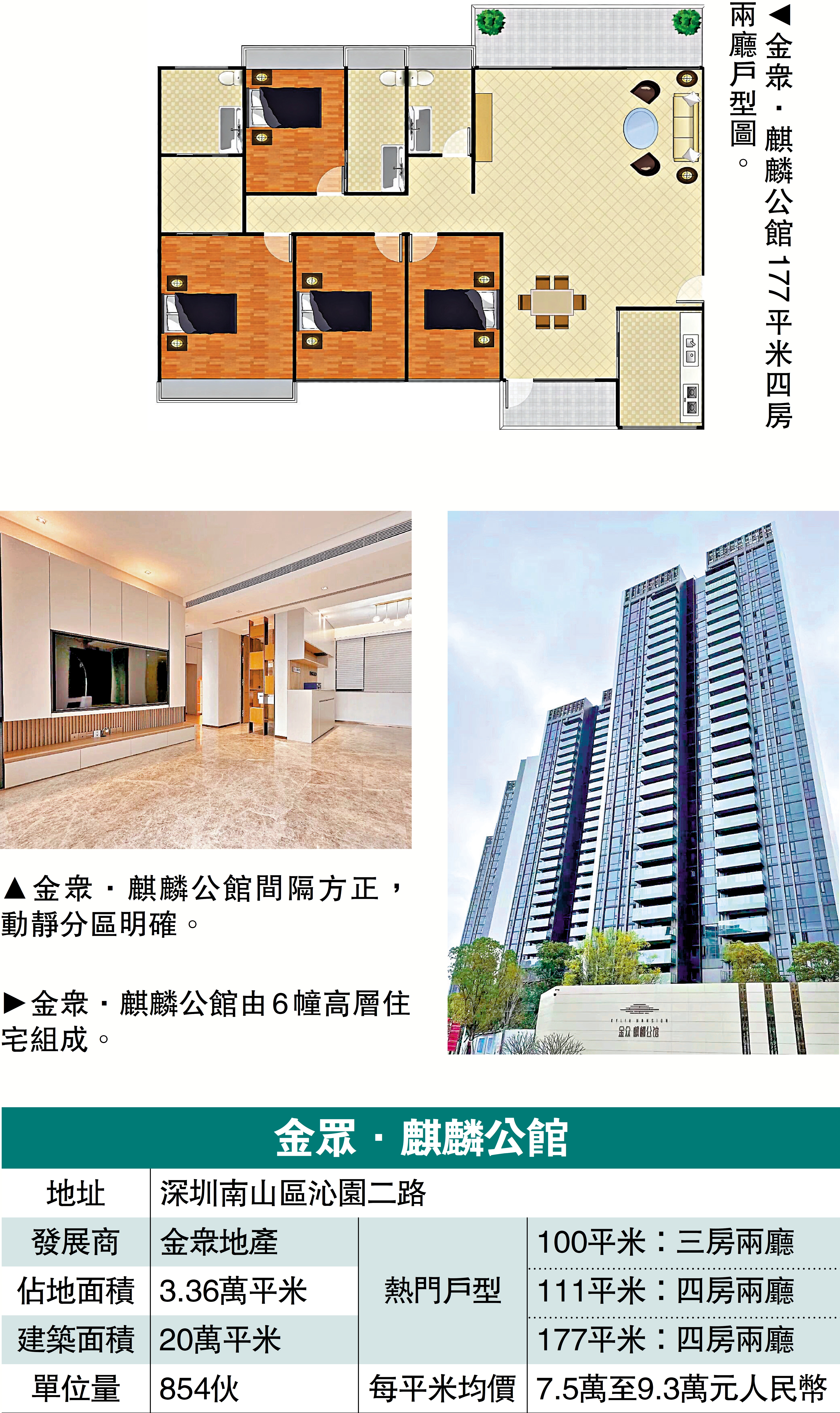 在戶型方面,金眾·麒麟公館主打單位面積由100至177平米,涵蓋三房至四房戶,間隔方正,動靜分區明確,客飯廳與睡房互不干擾,保證了私密性和舒適性,部分單位坐擁270度西麗湖景觀,盡享湖光山色。二手放盤每平米均價7.5萬至9.3萬元人民幣。