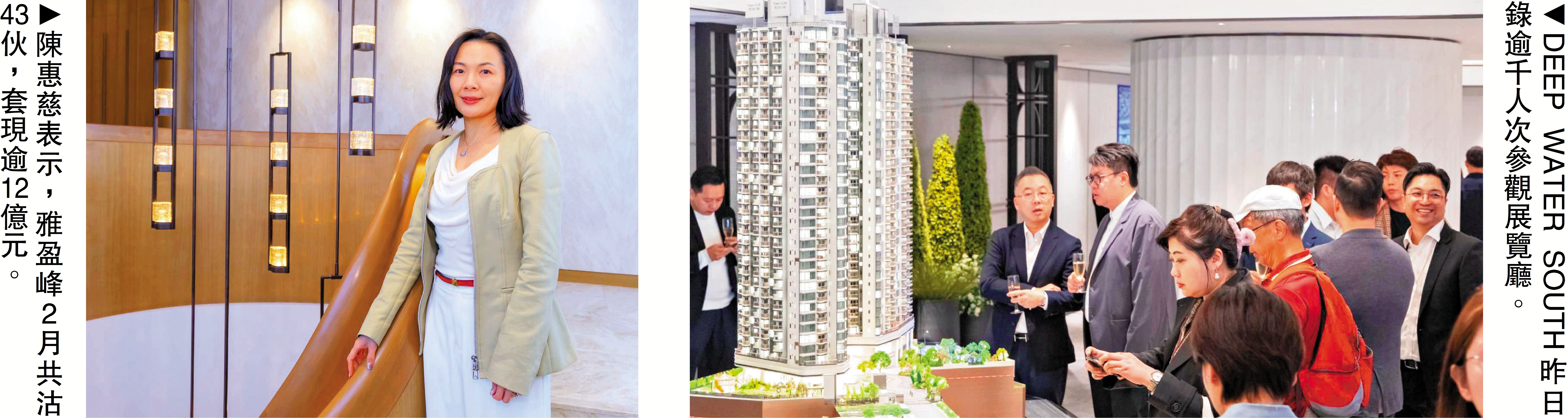 會德豐地產副主席兼常務董事黃光耀表示,DEEP WATER SOUTH昨天首日開放展覽廳予預約客戶參觀,錄逾1000名參觀人次,包括有本地老牌家族、金融、醫護專業人士、家族辦公室及城中名人。