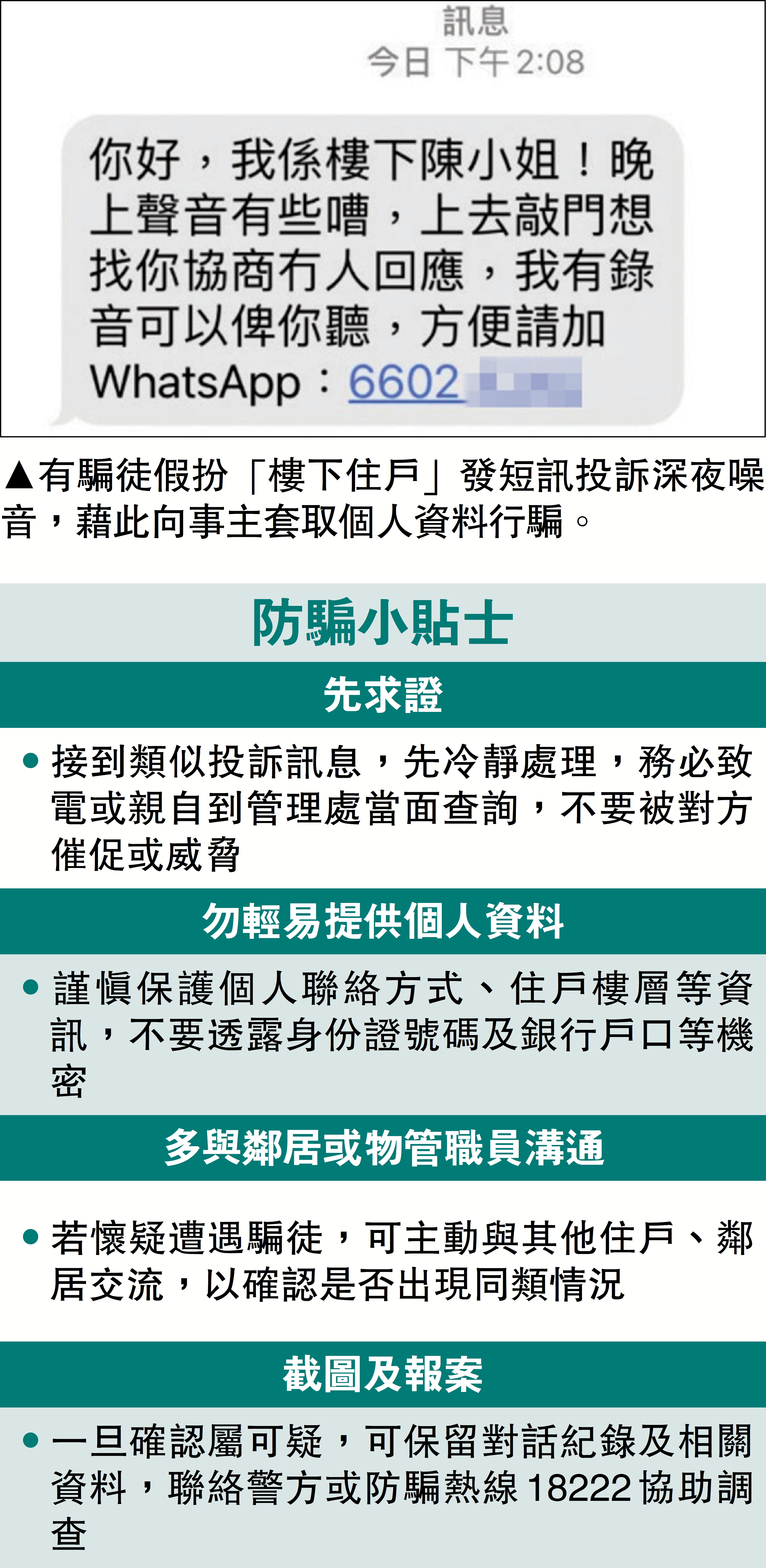 【大公報訊】記者盛德文報道:近年電訊詐騙手法層出不窮,近日,有讀者向《大公報》提供可疑短訊對話截圖,疑似近期新興詐騙手法──假扮「樓下住戶」投訴深夜噪音,再藉此向事主套取個人資料,進一步誘人入局行騙。私隱專員公署及警方提醒市民,慎防詐騙手法,切勿輕易透露個人資料及輕易相信初相識的陌生人;如有懷疑可致電防騙易熱線18222查詢,或截圖報案。