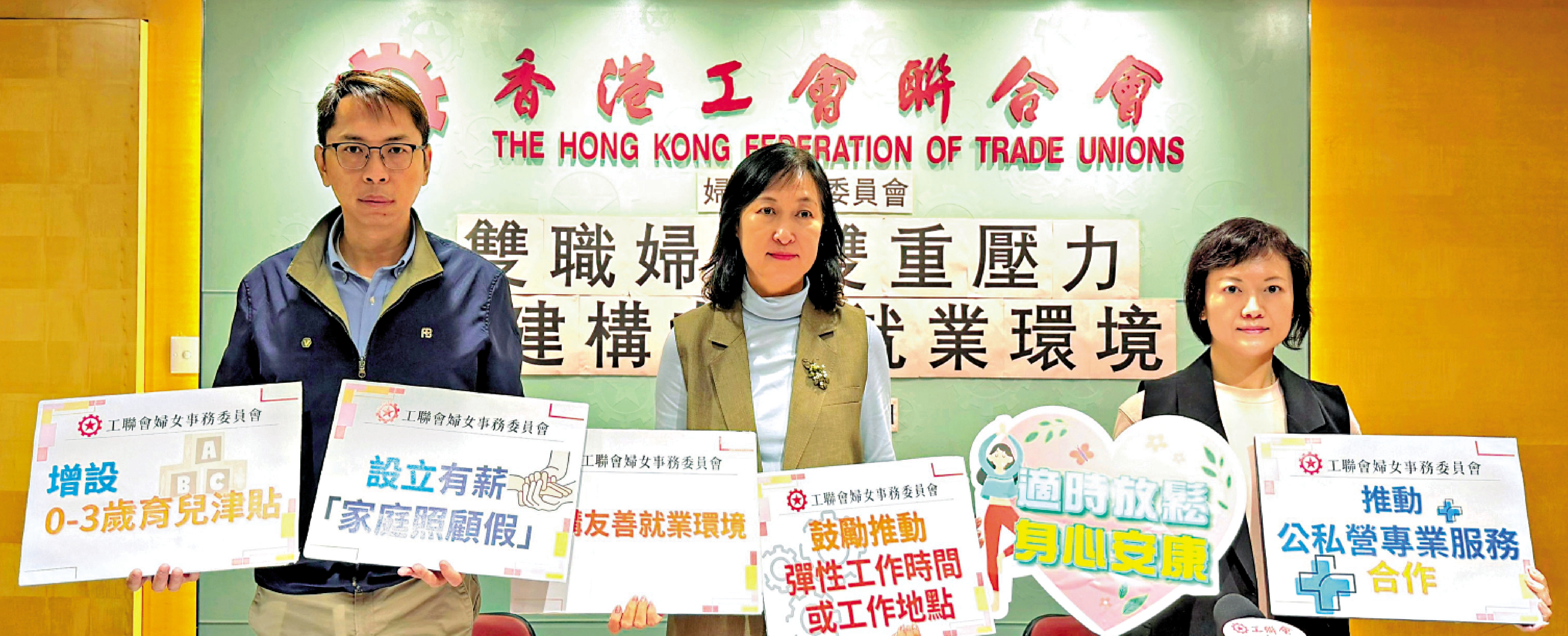 工聯婦委副主任陸頌雄引述調查指出,逾六成雙職婦女認為「彈性工作時間或地點」最能減壓,其次為設立有薪「家庭照顧假」及增加資助的長者日間照護中心名額。