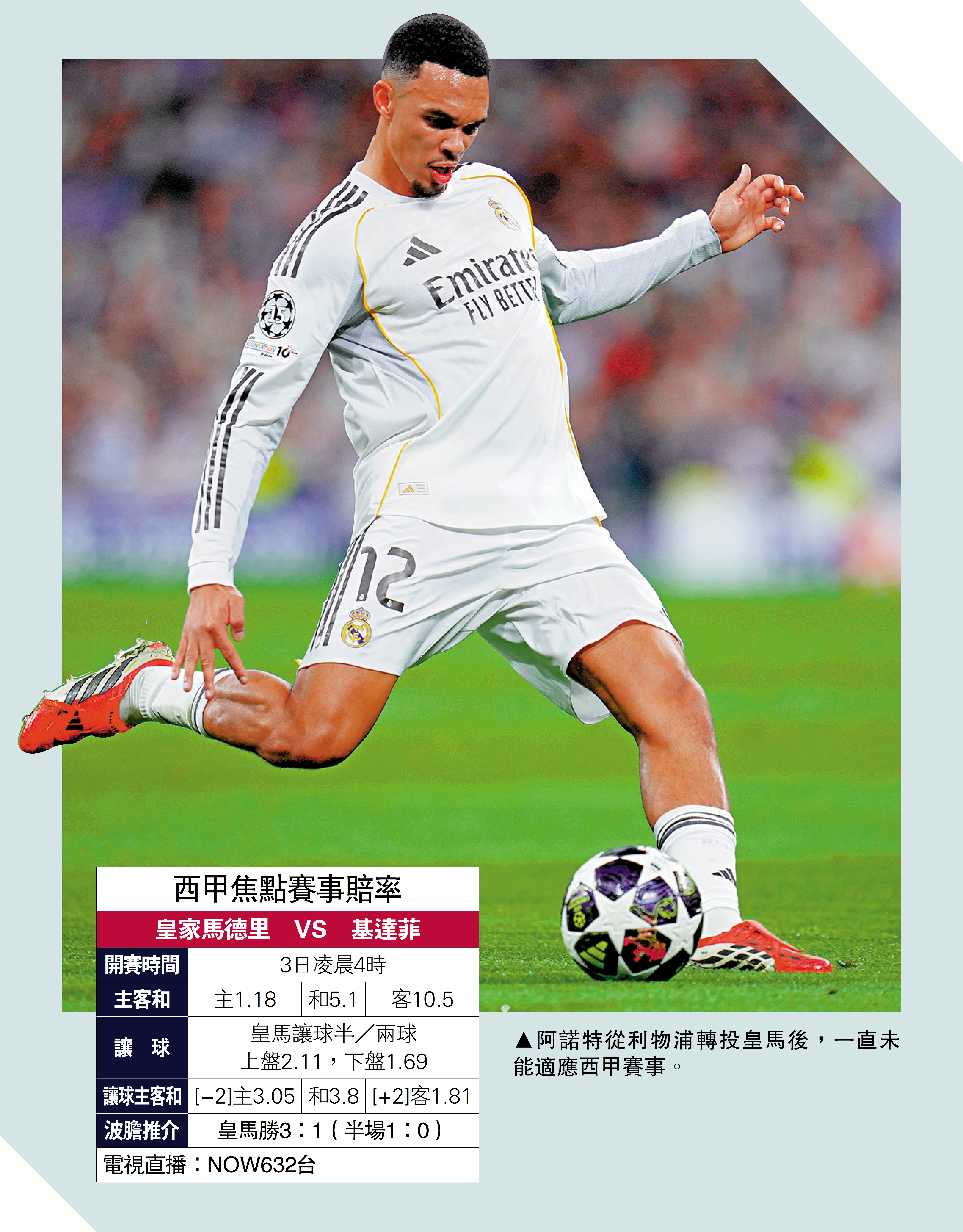 皇馬將於明晨西甲「馬德里市打吡」主場迎戰基達菲。皇馬在上輪輸波後又將榜首讓予巴塞隆拿,雖然此役有射手基利安麥巴比倦勤,但雲尼斯奧斯祖利亞近其大爆「怒火」入球不斷,有力繼續「士哥」協助皇馬擊退有多名球員傷停的基達菲,「讓球」皇馬讓球半/兩球可追上盤。(NOW632台3日凌晨4時直播)