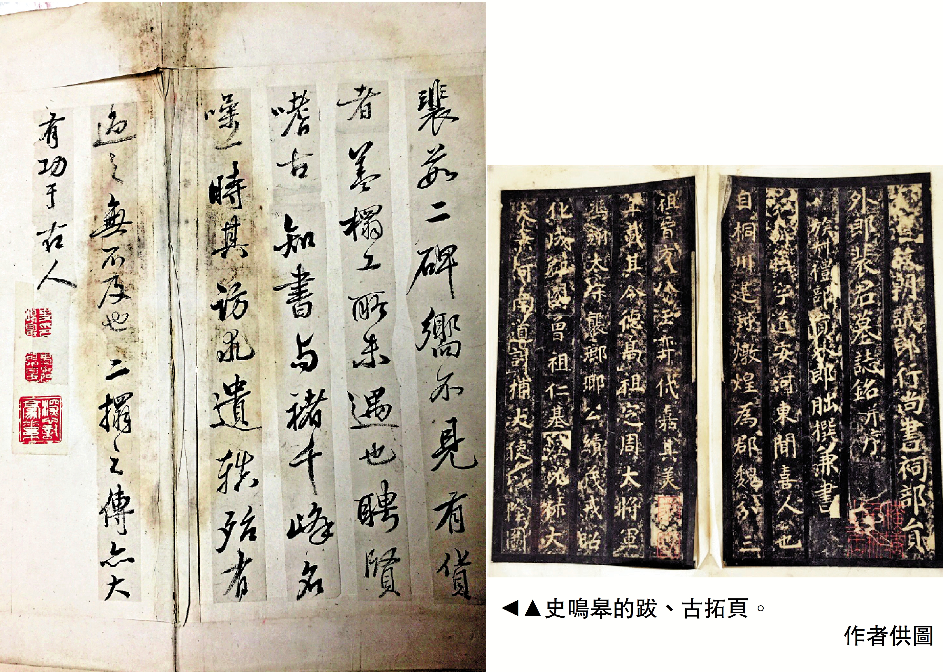 我的家族管氏,是江蘇如東有名的文化世家,位列掘港歷史上「何、陳、管、顧」四大家族之一,歷代文人輩出。當年,史鳴皋與如東管氏先人交往密切,常一同吟詩作畫、結社酬唱。一九二六年出版的《如皋管氏宗譜》中,便收錄了史鳴皋所撰的《乾翁管先生七十壽序》《太學生管公乾一暨汪孺人合傳》《管君天申傳》三篇文章。管乾一是管氏如東始祖管重和的第十二世後裔,而我祖父一輩已是第十八世,相隔六代。我的祖父管鮑知,又名管儉齋,是清末監生,在掘港以經營「管慎盛紙馬店」聞名。所謂「紙馬」,是舊時的祭祀用品,即用木刻版印在紙上的菩薩像,亦稱「菩薩紙」,當年遍布掘港老街的「紙馬店」,是當地商業的一大特色。《如東民間文化叢書·風物卷》中曾提及管慎盛紙馬店的盛況:「其自製的紙馬品種最全,西郊的幾大園以及附近的農民、市民,臘月『請大發』,絕大多數到該店,遠客還會被留着吃一頓飯。」祖父在經營之餘,酷愛收藏,書畫、碑帖皆在其「雅藏」之列。這本留有地方名士史鳴皋書法與印章的碑帖,無疑是他當年的心頭好,經世代相傳,才得以留存至今。