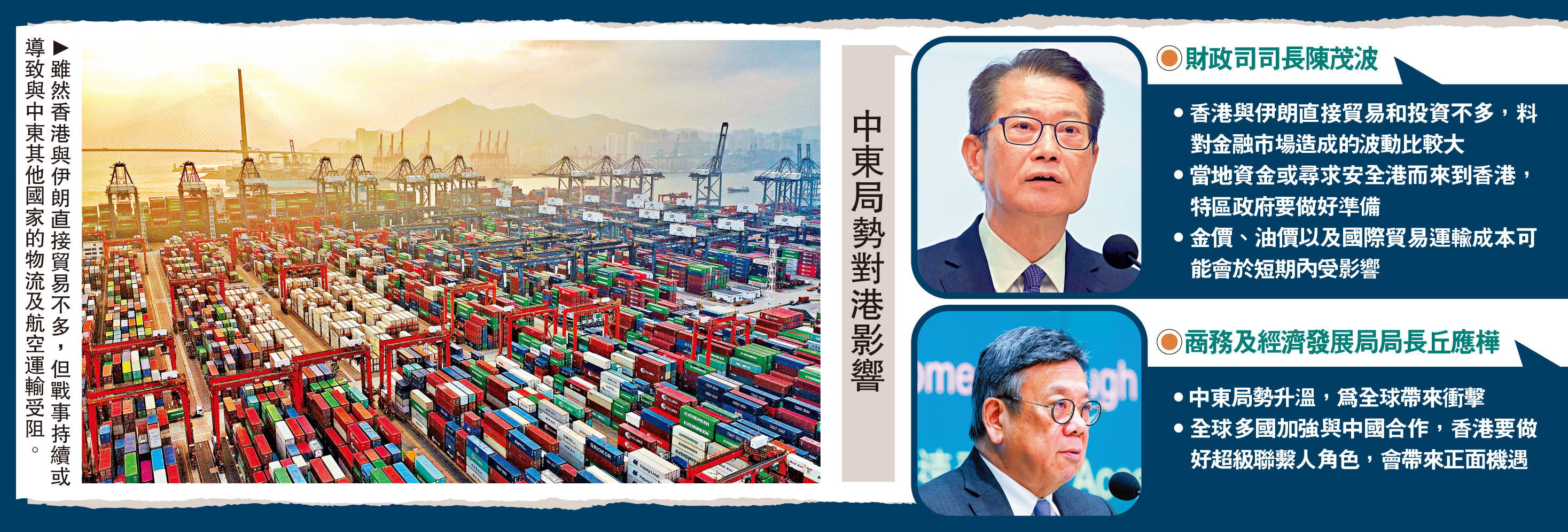 中東戰火再燃,美以悍然襲擊伊朗。財政司司長陳茂波表示,香港與伊朗直接貿易和投資不多,但有關戰事對環球造成很大不確定性,預料對金融市場的波動會較大,強調特區政府已有足夠預案作出應對。商務及經濟發展局局長丘應樺亦指,全球多國正加強與中國合作,香港要做好超級聯繫人的角色,會帶來正面機遇。\大公報記者 邵淑芬