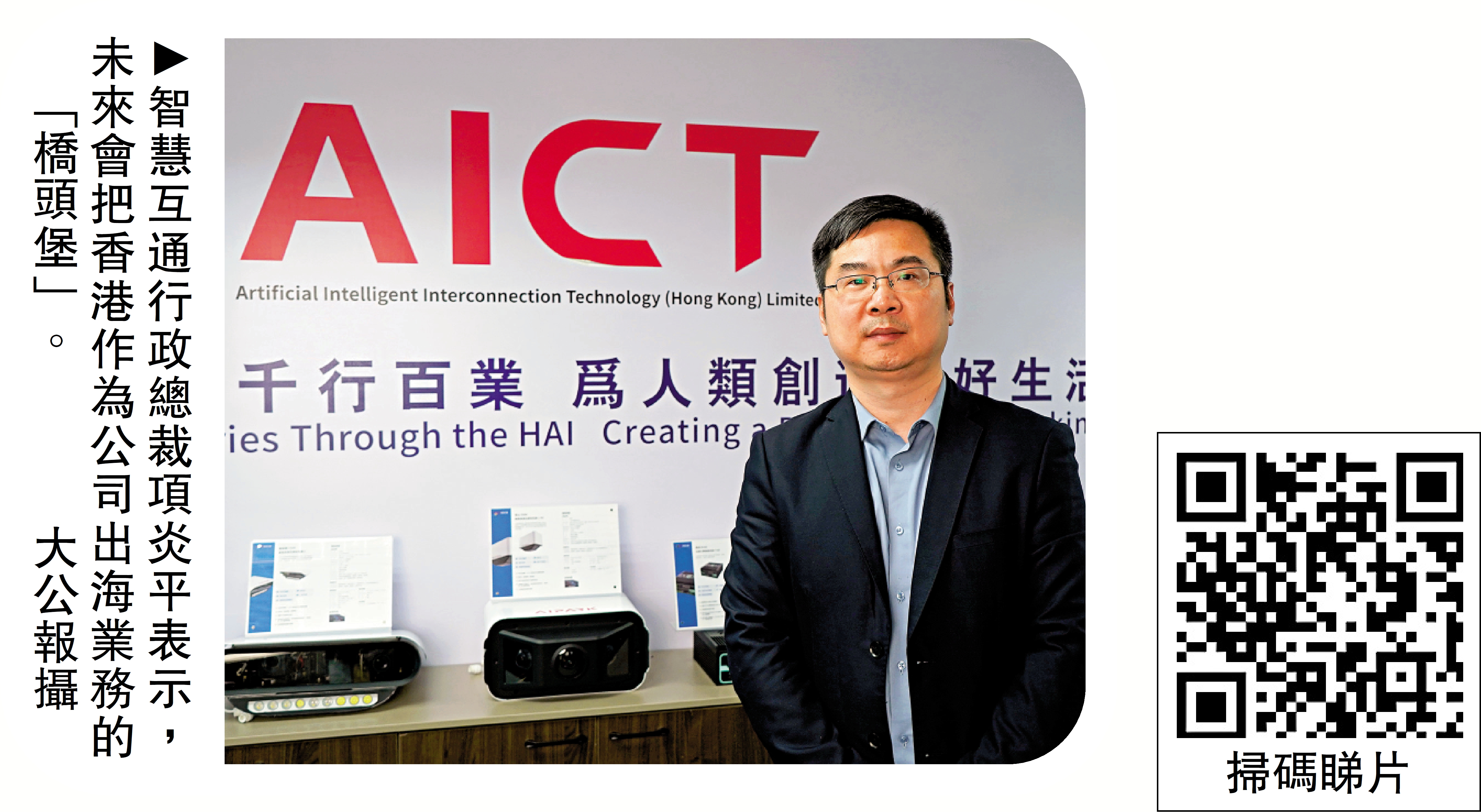 高精度人工智能技術產品及解決方案提供商智慧互通(AICT)正持續加碼投資香港,不僅看好香港平台角色,將香港定位為企業出海的支撐點;並於去年10月底在港提交上市申請,衝刺「高精度AI第一股」,加碼發展AI空間智能。智慧互通行政總裁項炎平接受《大公報》採訪時表示,會加大力度拓展海外市場,將人工智能產品和技術方案複製到其他地區,目標未來3至5年,內地和海外收入各佔收入五成。