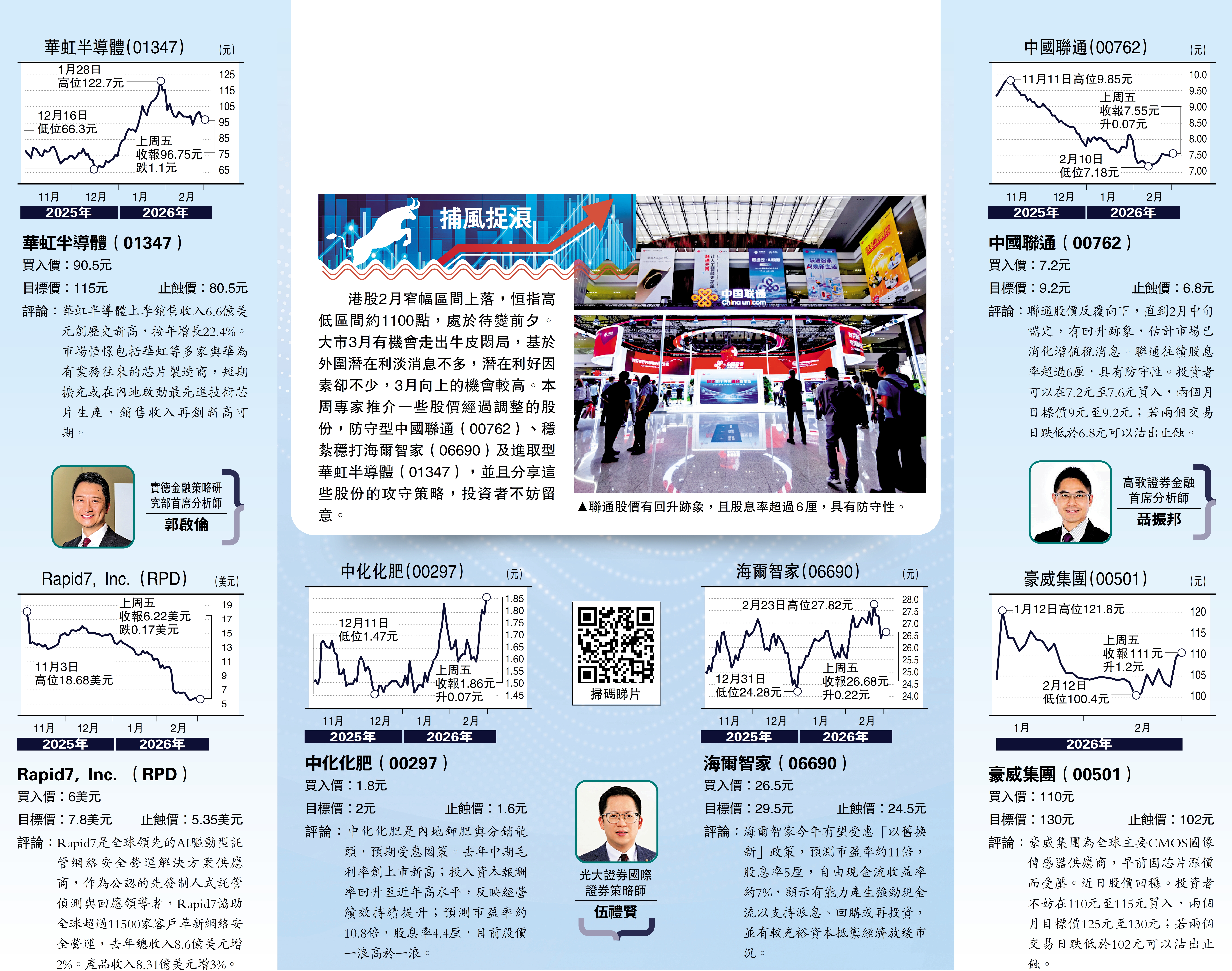 港股2月窄幅區間上落,恒指高低區間約1100點,處於待變前夕。大市3月有機會走出牛皮悶局,基於外圍潛在利淡消息不多,潛在利好因素卻不少,3月向上的機會較高。本周專家推介一些股價經過調整的股份,防守型中國聯通(00762)、穩紮穩打海爾智家(06690)及進取型華虹半導體(01347),並且分享這些股份的攻守策略,投資者不妨留意。