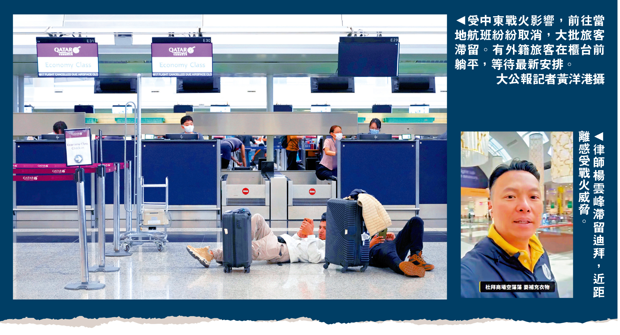 有港人因航班停飛被迫滯留迪拜,表示空襲首日半夜,下榻的酒店突然響起警報,住客被勸喻留在酒店大堂,他感慨「貼近戰爭,才會更懂得珍惜和平的可貴,香港真係好好」,他期盼能盡快平安回家。\大公報記者 黃佩琳、肖泓宇、鄭文迪