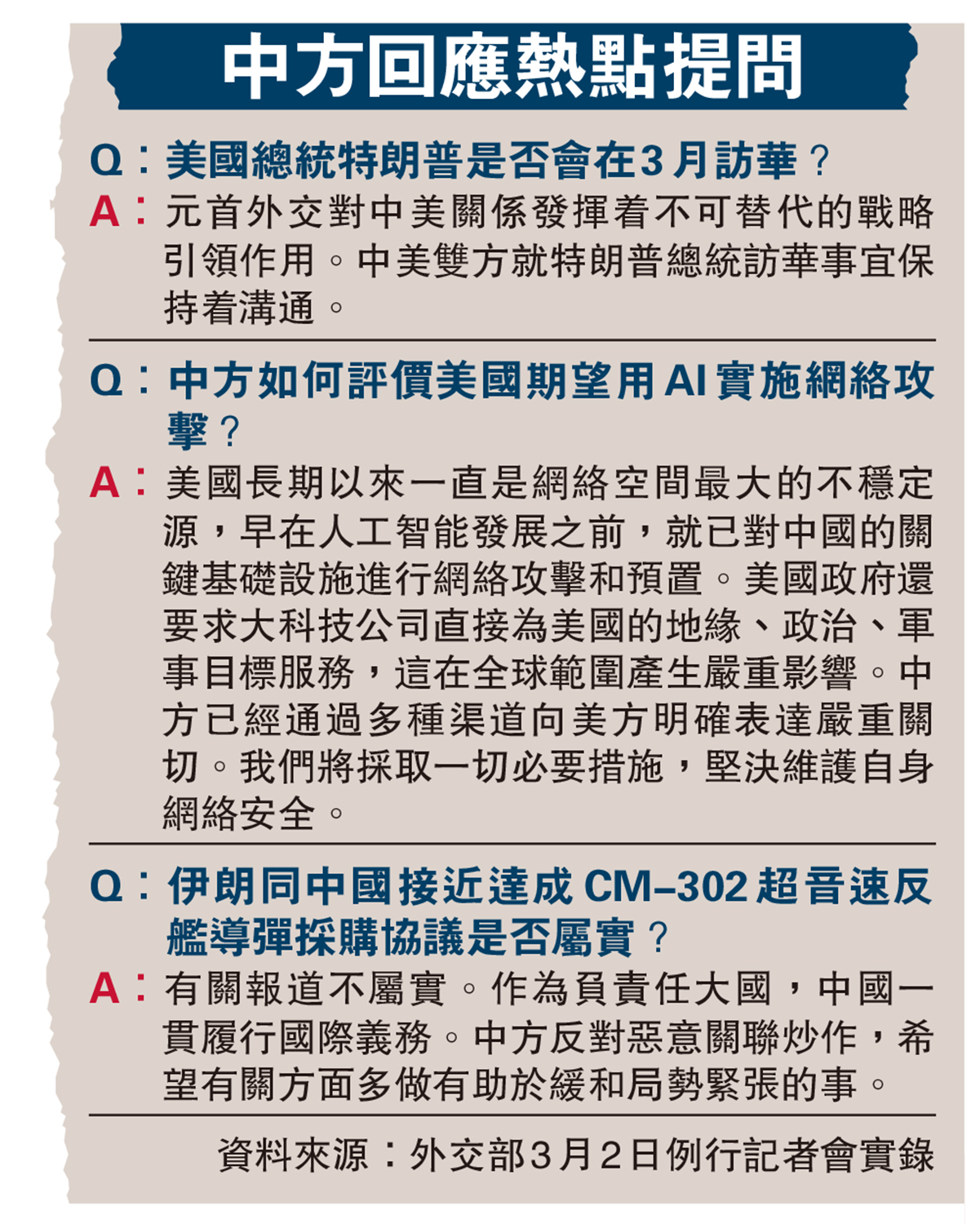 3月2日,中國外交部發言人毛寧在例行記者會上表示,關於美國的軍事行動,中方沒有提前得到通報。毛寧強調,中方對當前局勢深表關切,堅決反對在國際關係中使用武力侵犯別國主權安全。當務之急是立即停止軍事行動,防止戰火蔓延和外溢。中方願同國際社會共同努力,積極勸和阻戰,推動通過對話談判解決問題,維護中東和世界的和平穩定。