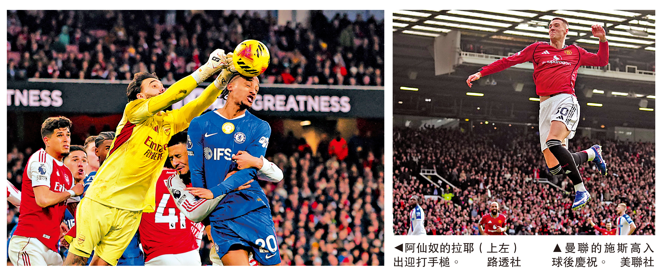 【大公報訊】記者梁潤森報道:英超阿仙奴及曼聯在香港時間3月2日同於主場出擊,分別對陣車路士及水晶宮。阿仙奴憑威廉沙利巴及祖利安添巴各入一球贏2:1,不過更重要的功臣是連番作出神救的門將大衛拉耶,主帥阿迪達認為拉耶保住阿仙奴爭冠夢;上半場落後的曼聯由般奴費南迪斯及班捷文施斯高各入一球以2:1反勝水晶宮,其中施斯高近5場聯賽攻入4球。