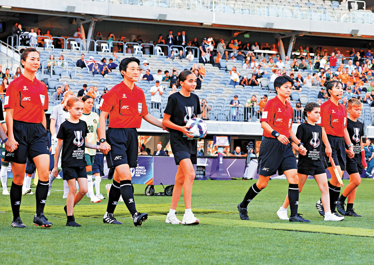 【大公報訊】據新華社報道:以董方雨為主裁判的中國裁判組,執裁3月1日舉行的女足亞洲盃揭幕戰。當地時間1日下午5時,東道主澳洲隊與菲律賓隊的揭幕戰在可容納6萬人的珀斯體育場開賽。