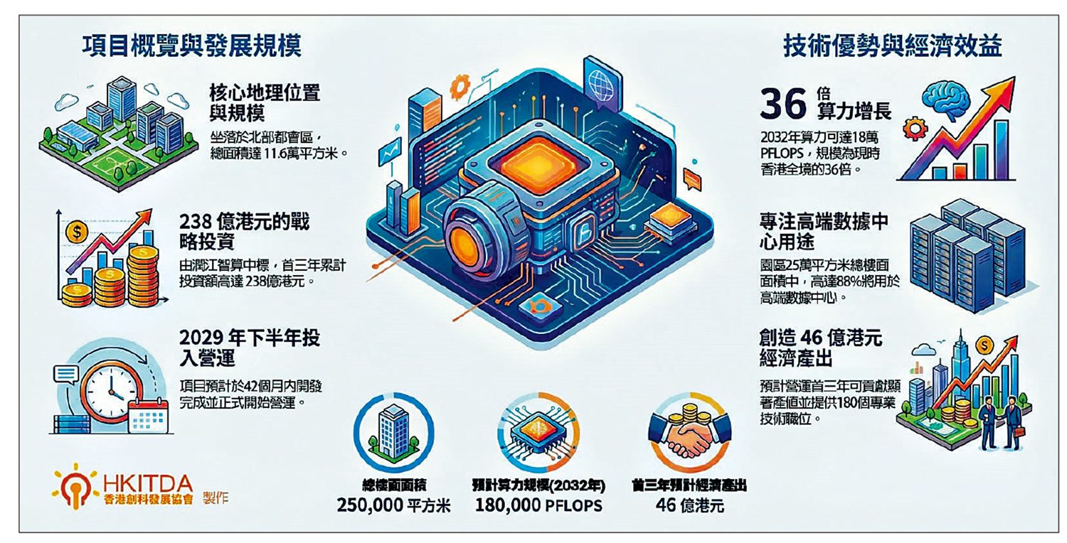 中標公司承諾在42個月內開始營運,開發至投入營運首三年累計投資達238億元。25萬平方米的總樓面面積中,接近九成將用於高端數據中心用途,預計營運首三年可創造約46億元的經濟產出,以及約180個技術性職位。