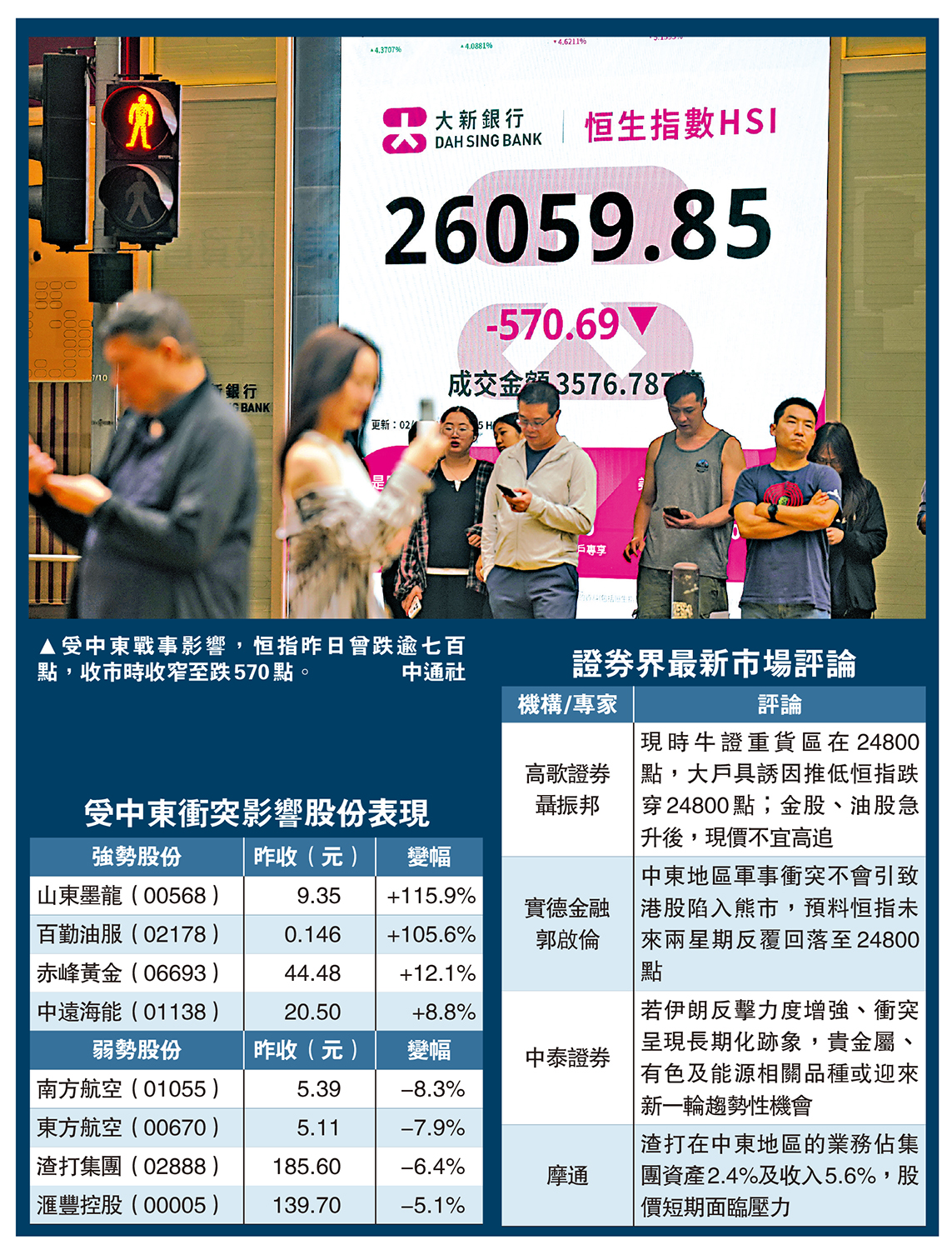 美國、以色列向伊朗發動攻擊後,軍事衝突伸延至中東其他地區,加劇市場對戰爭擴大的憂慮。投資者減持倉位避險,港股受壓回落。恒指昨日最多跌749點,低見25882點,收市時跌幅稍為縮窄至570點,報26059點,險守二萬六心理關口,但跌穿一月中旬以來的三重底。主板成交額3576億元,較上日增加692億元。