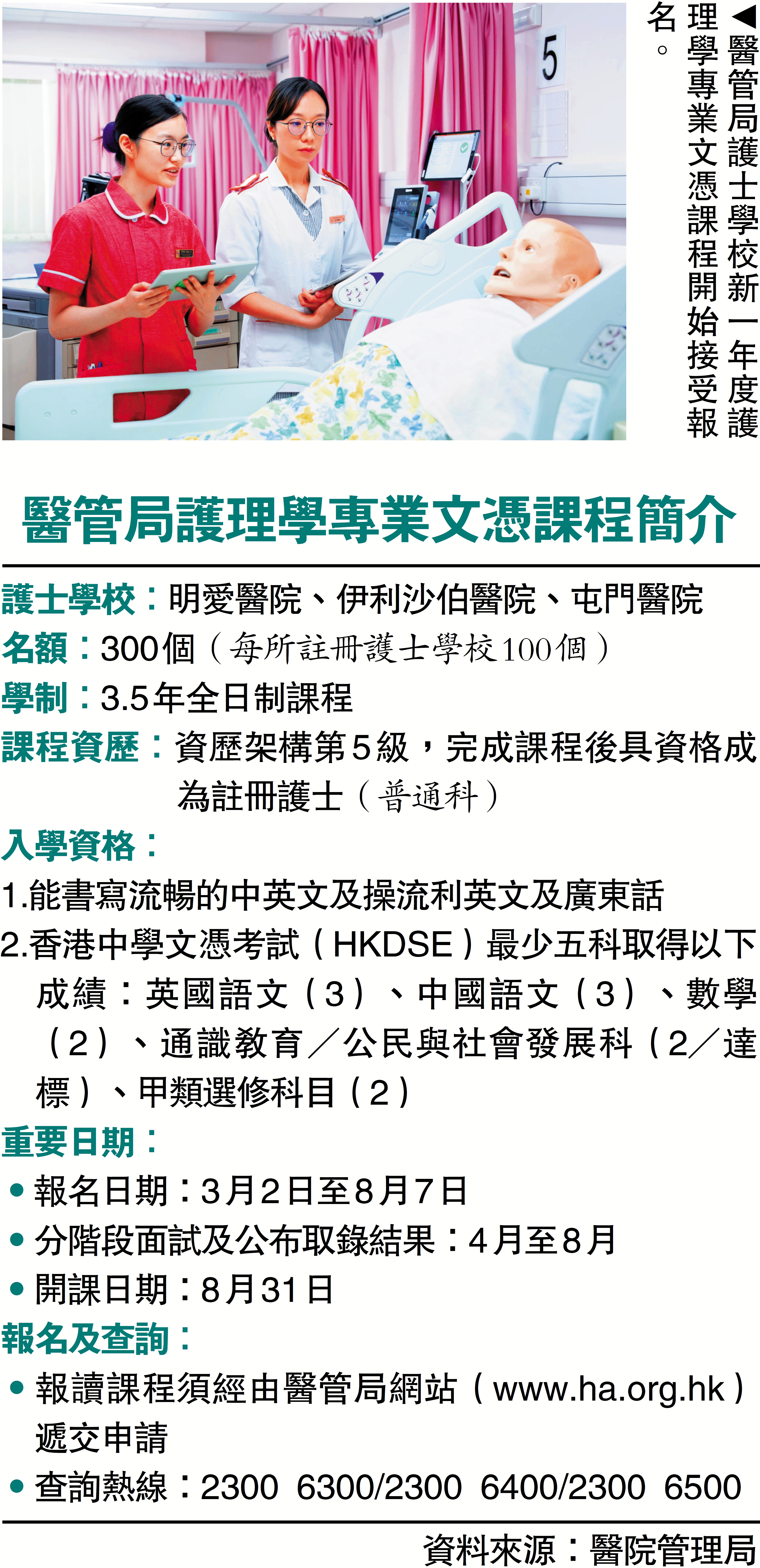 醫管局由去年起,正式將明愛醫院、伊利沙伯醫院、屯門醫院的註冊護士學校及葛量洪醫院的登記護士學校,整合成為醫管局護士學校,由醫管局學院集中管理,共享教學資源。本次招生的為前三所註冊護士學校,每所招收100人。課程將在4月至8月分階段面試及公布取錄結果,8月31日開課。2025/26學年收費為133600元,2026/27學年收費待定。