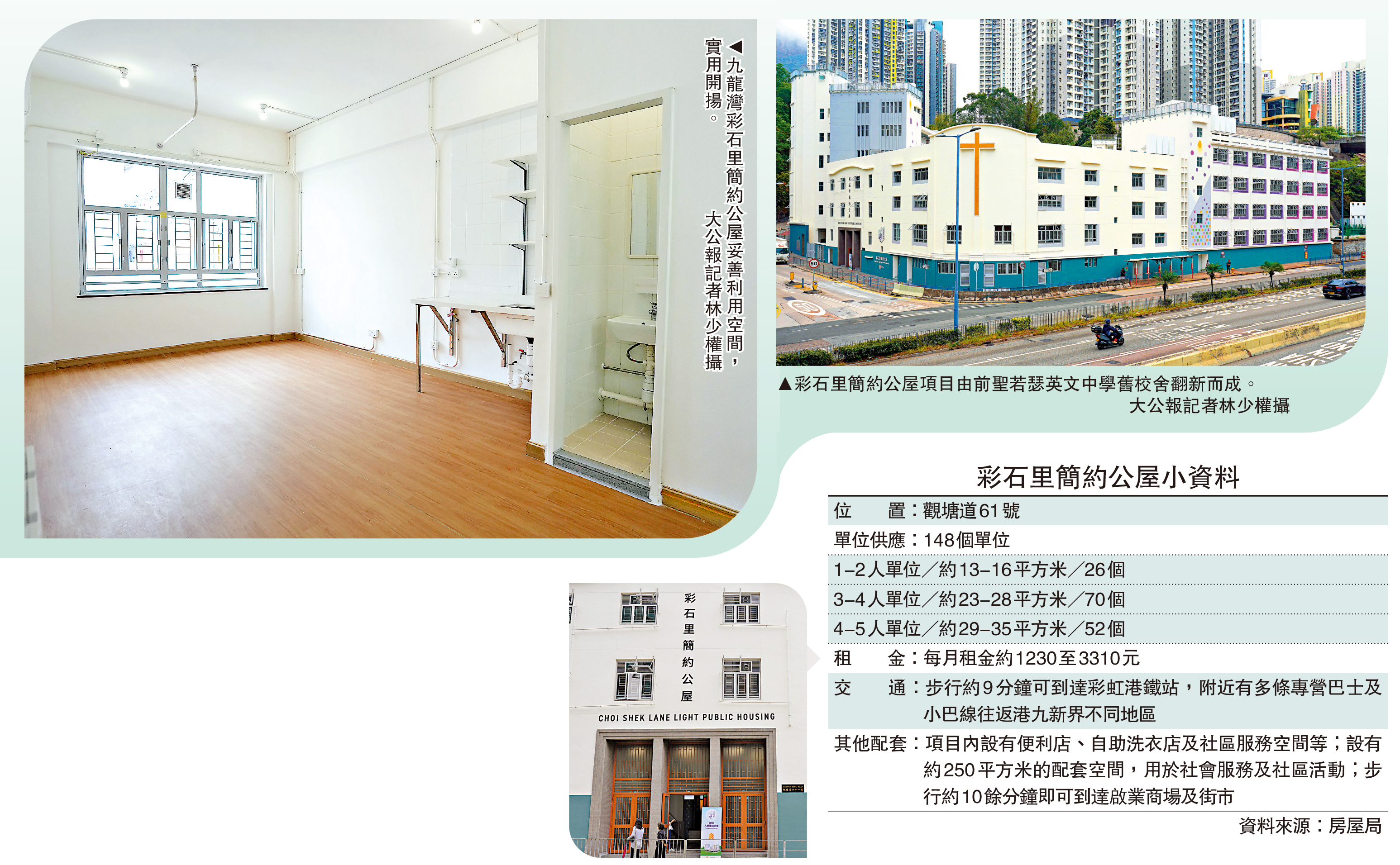 簡約公屋供應今年步入豐收期。由舊校舍改建而成的九龍灣彩石里簡約公屋昨日開始入伙,合共提供148個單位,項目翻新過程保留建築特色及妥善利用空間。房屋局局長何永賢出席入伙儀式時表示,連同彩石里項目在內,過去一年共有約9600個簡約公屋單位落成並陸續入伙,每個項目都在短時間內百分百入伙,預告還有逾2萬個簡約公屋單位將於年中起陸續落成,讓身處惡劣居所環境的居民「有得揀」,強調現屆政府有「底氣」解決房屋問題。\大公報記者 張騰