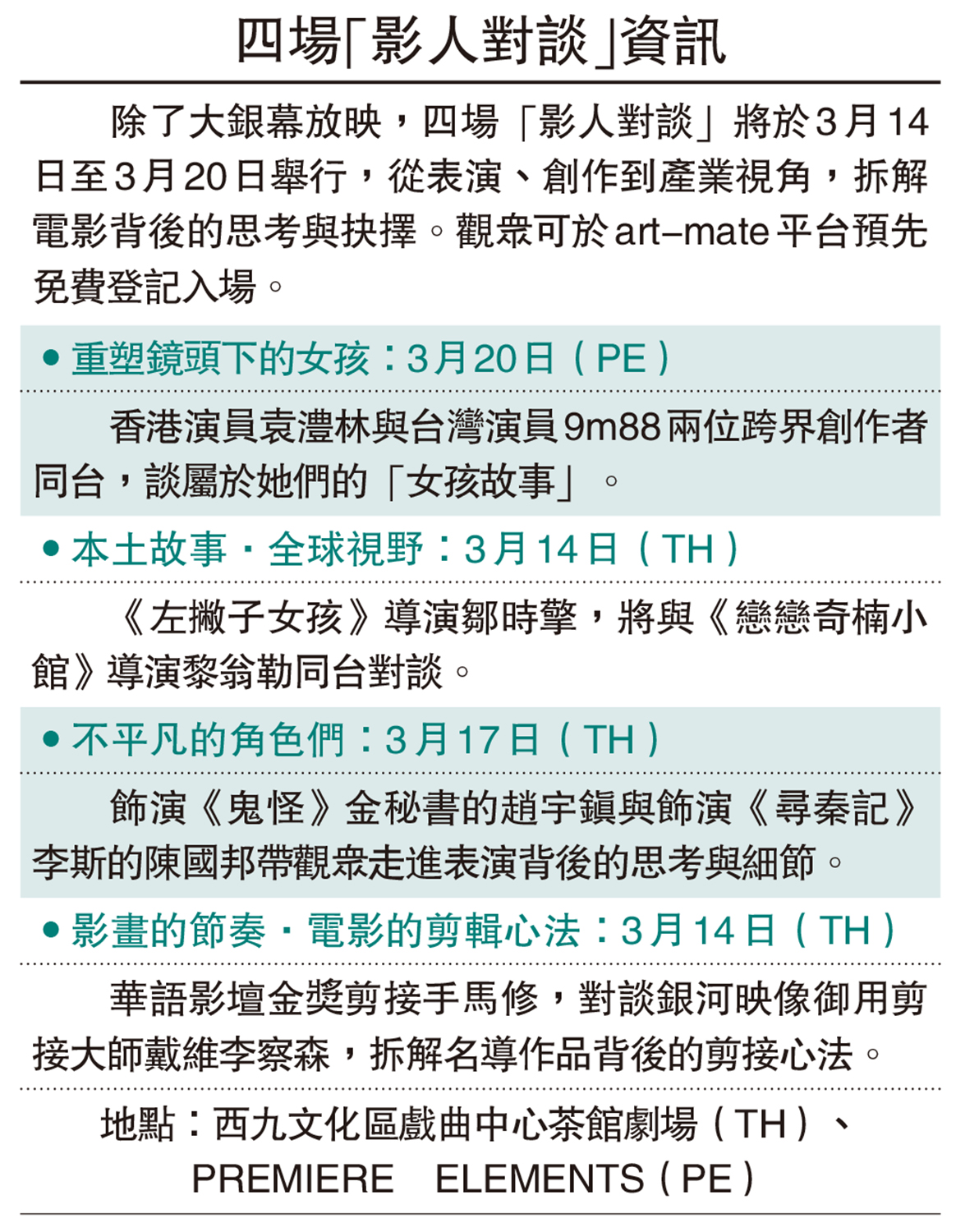 除了大銀幕放映,四場「影人對談」將於3月14日至3月20日舉行,從表演、創作到產業視角,拆解電影背後的思考與抉擇。觀眾可於art-mate平台預先免費登記入場。