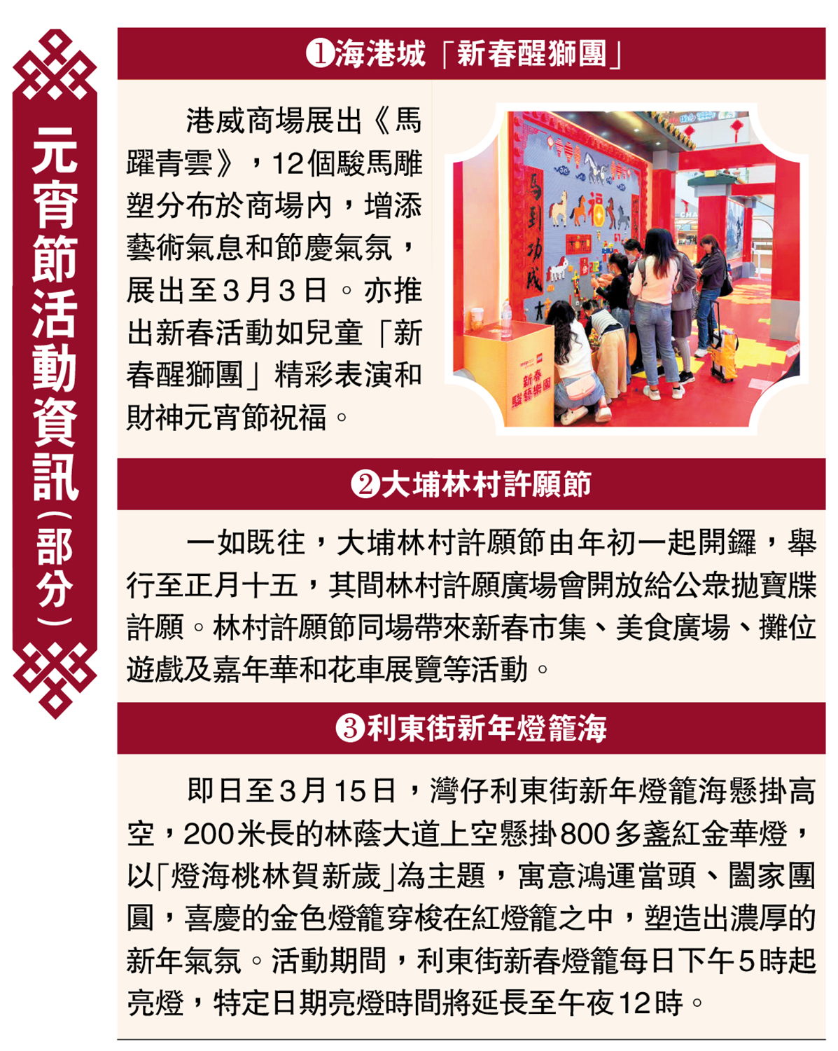 港威商場展出《馬躍青雲》,12個駿馬雕塑分布於商場內,增添藝術氣息和節慶氣氛,展出至3月3日。亦推出新春活動如兒童「新春醒獅團」精彩表演和財神元宵節祝福。