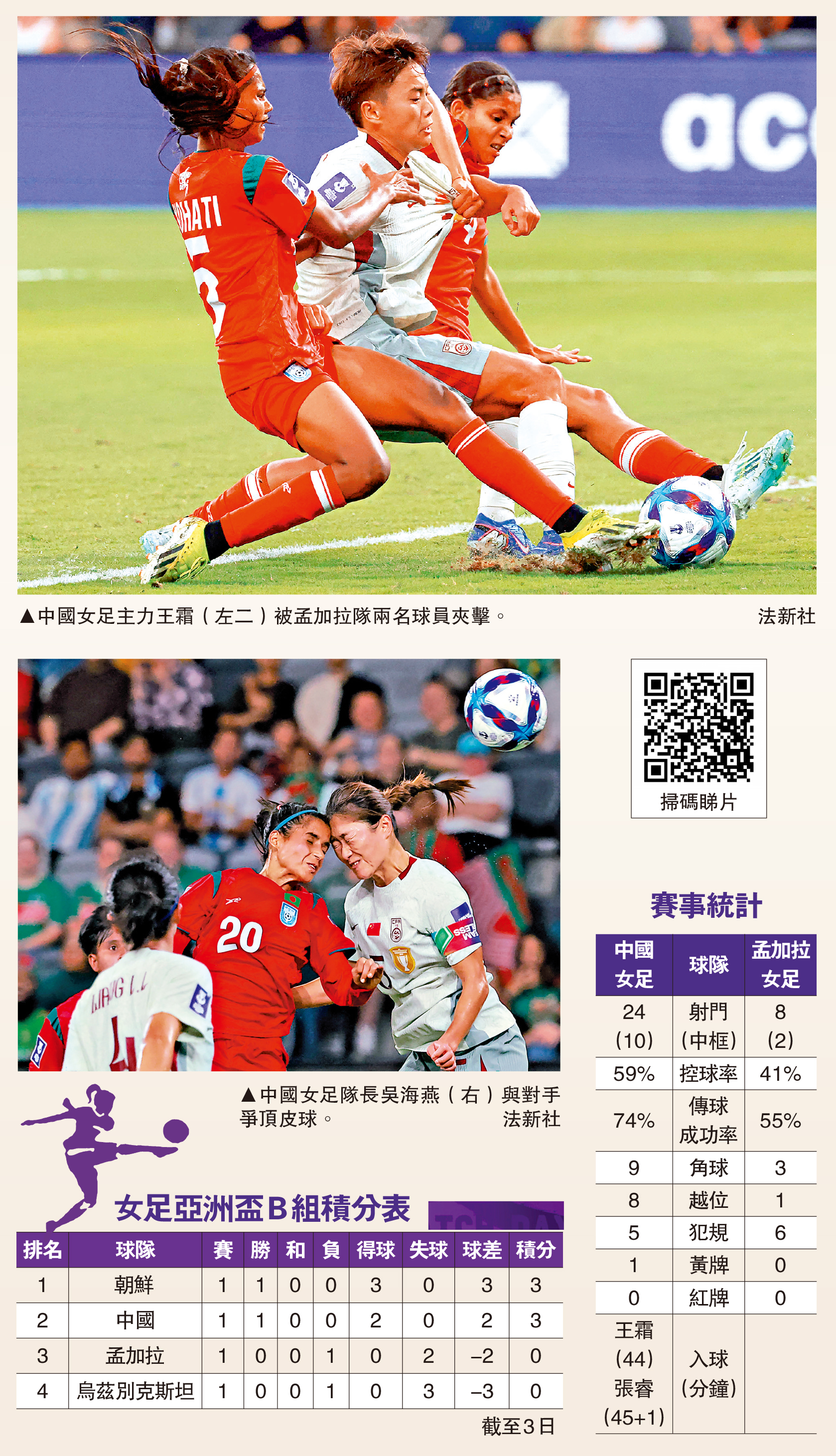 2026女足亞洲盃決賽周在元宵節(3日)繼續上演,爭取衛冕冠軍的中國女足於B組對陣孟加拉隊。在全場近6成控球率下,中國女足憑着王霜及張睿在上半場各建一功,最終以2:0旗開得勝。同日同組另一仗,朝鮮隊以3:0擊敗烏茲別克斯坦隊,暫以較佳的得失球差位列小組首位,中國女足則居次席。\大公報記者 朱家立