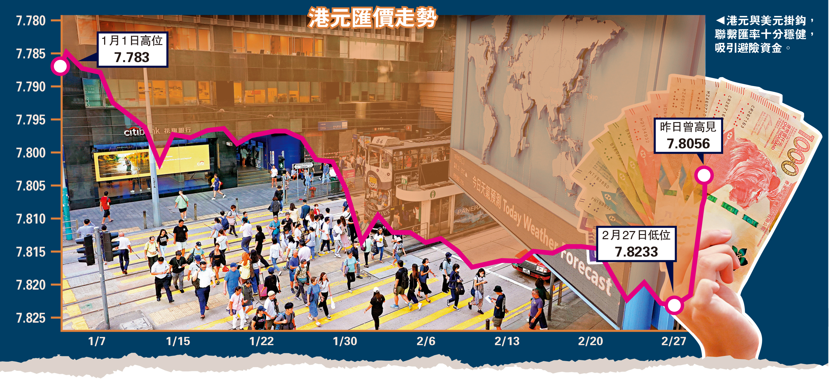 李若凡指出,港元與美元掛鈎,聯繫匯率亦十分穩健,自然吸引避險資金。至於昨日港匯急升,則與港元套息交易平倉有關。她預期,由於美元強勢,港匯再升空間有限,除非有資金流入股市或新股市場,否則料港匯於7.8水平左右上落。