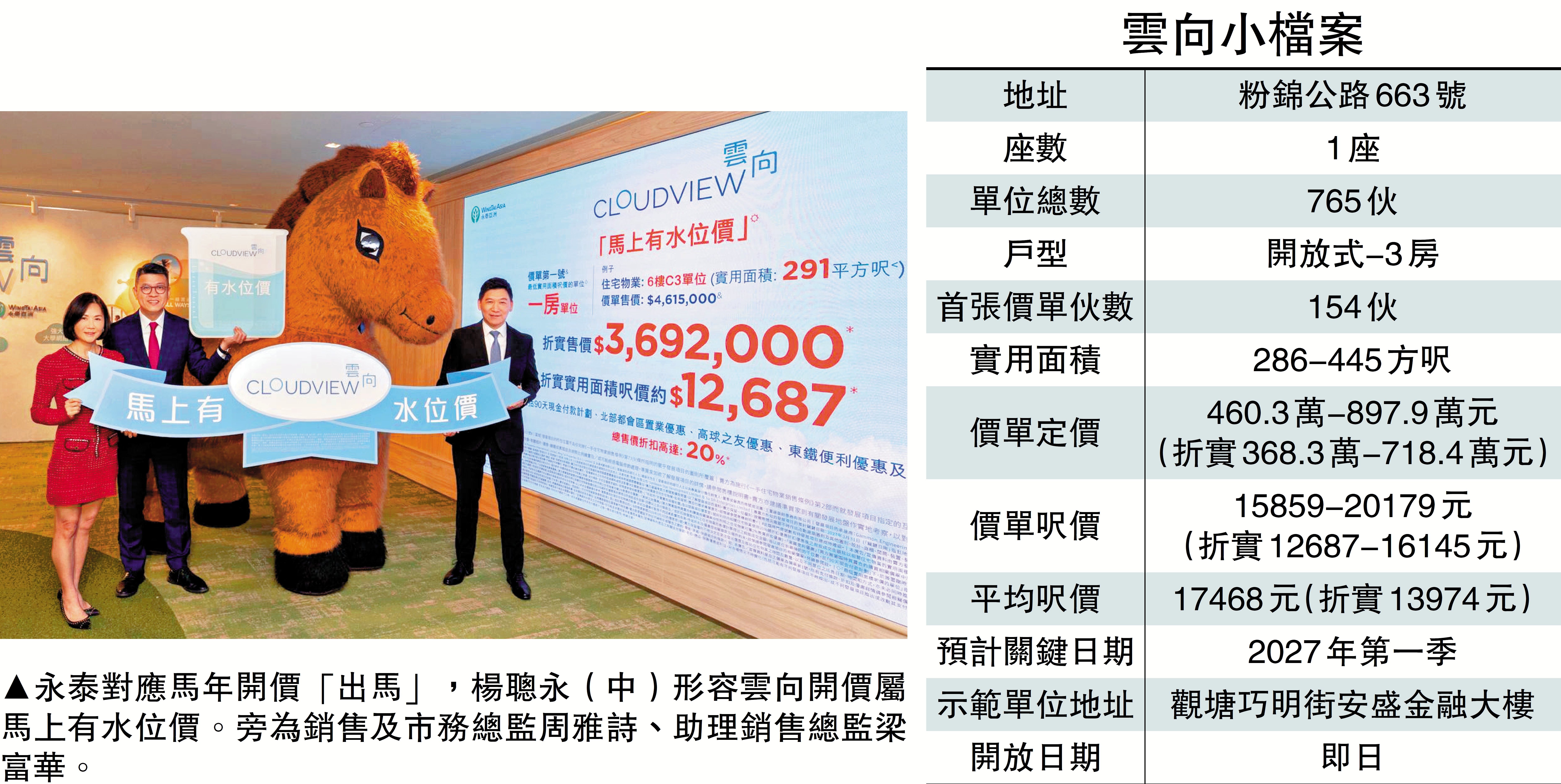 【大公報訊】馬年新盤蜂擁搶閘,繼瑧玥開價後,永泰地產(00369)旗下新界北粉錦公路雲向,緊接公布首張價單涉及154伙,折實入場費368.3萬元,折實平均呎價13974元,較毗鄰9年前開賣的高爾夫·御苑低12%。