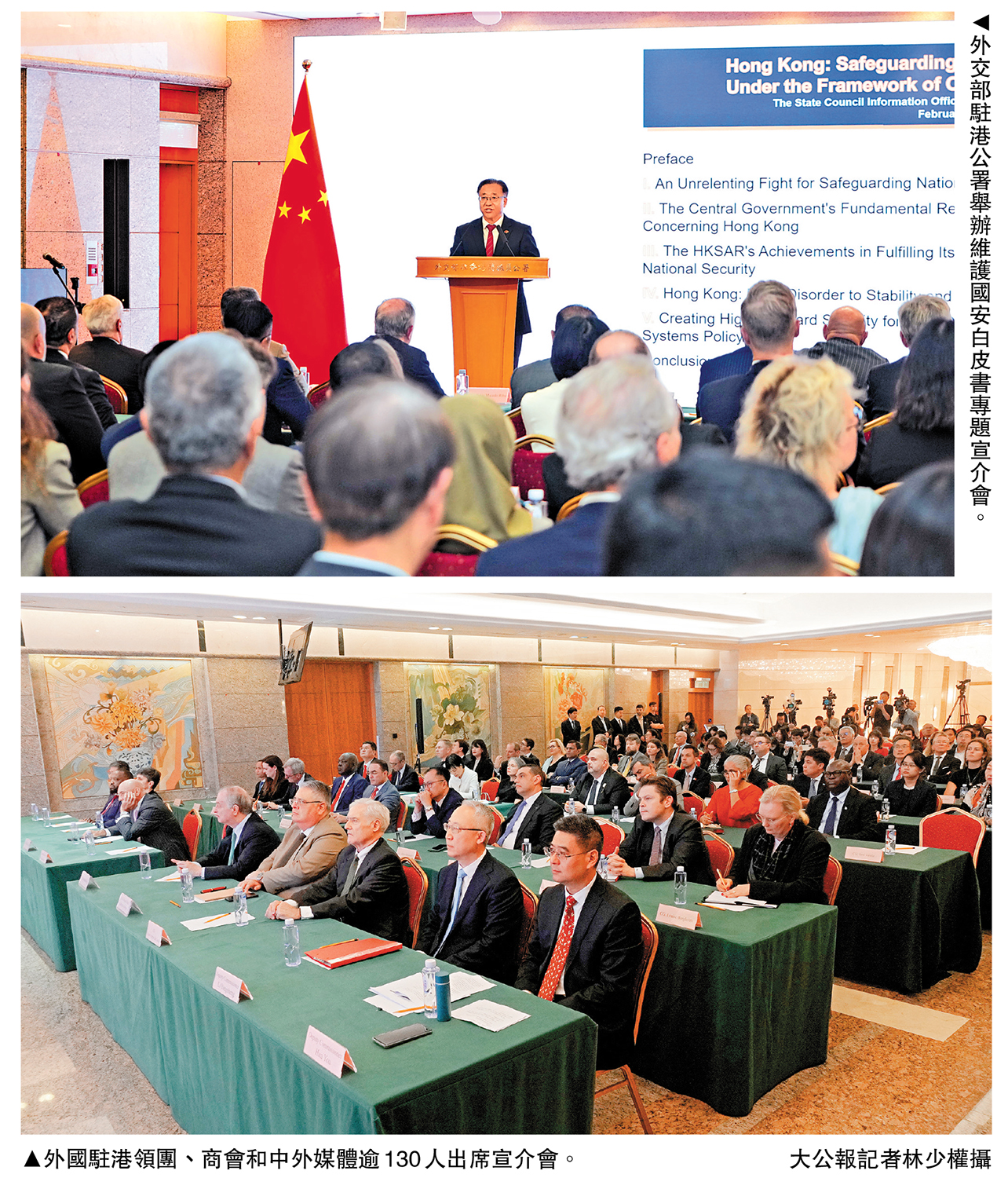 【大公報訊】3月3日,外交部駐港公署為外國駐港領團、商會和中外媒體舉辦《「一國兩制」下香港維護國家安全的實踐》白皮書專題宣介會,崔建春特派員作主旨宣講。來自50多家外國駐港總領館的總領事和領事官員,10多家外國商會負責人,多家國際組織或其駐港機構負責人,近30家中外媒體負責人或記者,共130餘人出席。