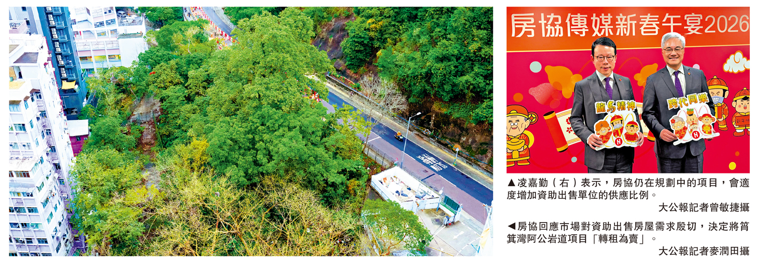 目前,房協規劃及興建中的項目有20多個,2026/27年度起的未來5年,將提供超過1.5萬個單位。凌嘉勤表示,資助出售房屋的需求持續,房協會於仍在規劃中的項目,適度增加資助出售單位的供應比例,當中包括筲箕灣阿公岩道項目,將會由出租屋邨改為資助出售房屋,預計5至6年後落成,可提供約500伙。房協亦會總結過去兩年推出專用安置屋邨項目的經驗,檢視出售及出租單位的需求。凌嘉勤表示,房協對調整出租及出售房屋比例不設硬指標,會視乎項目情況,細節仍待與當局商討。