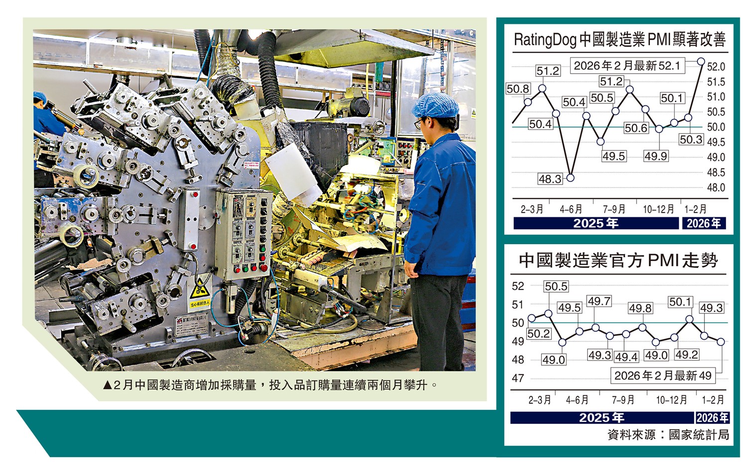 中國製造業運行呈現顯著「淡季不淡」特徵。標普和RatingDog(RD)昨日發布的2月中國製造業PMI報52.1,較前值升1.8個百分點,改善度為2020年12月以來最勁。國家統計局同日發布的2月中國製造業PMI則按月回落0.3個百分點至49,但大型企業景氣度加快擴張等積極因素仍續累積。分析稱,季節性擾動環境中,中國製造業仍展現出較強韌性。在全國兩會政策密集發布窗口期,市場信心將顯著提振,本月製造業景氣度大概率趨穩回升運行。\大公報記者 倪巍晨