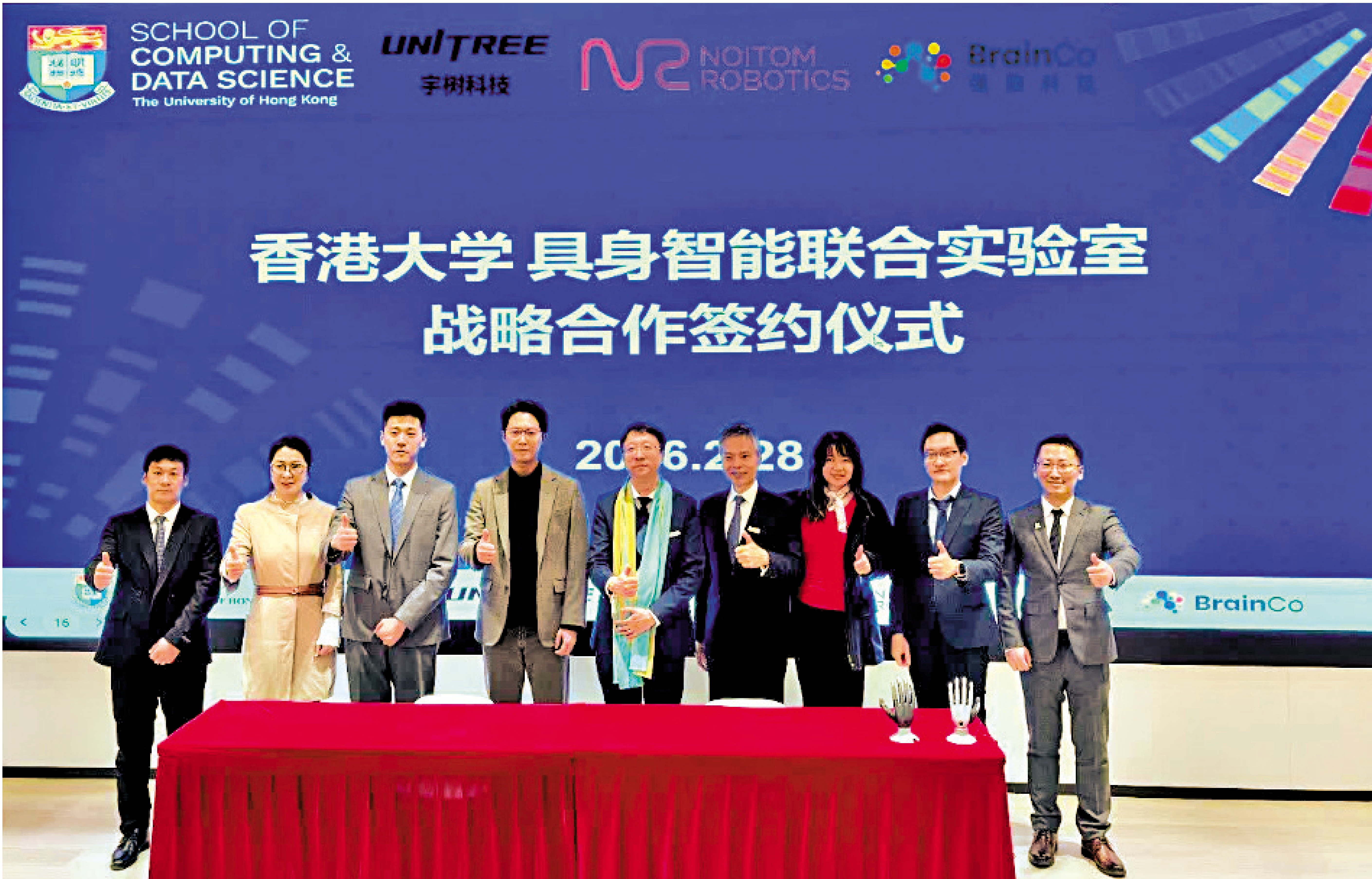 【大公報訊】記者郭如佳報道:香港大學昨日於港大張江基地舉行具身智能聯合實驗室戰略合作簽約儀式。港大分別與宇樹科技、諾亦騰機器人、強腦科技三家企業正式簽署合作協議,標誌着四方在具身智能領域產學研深度融合邁出實質性步伐。