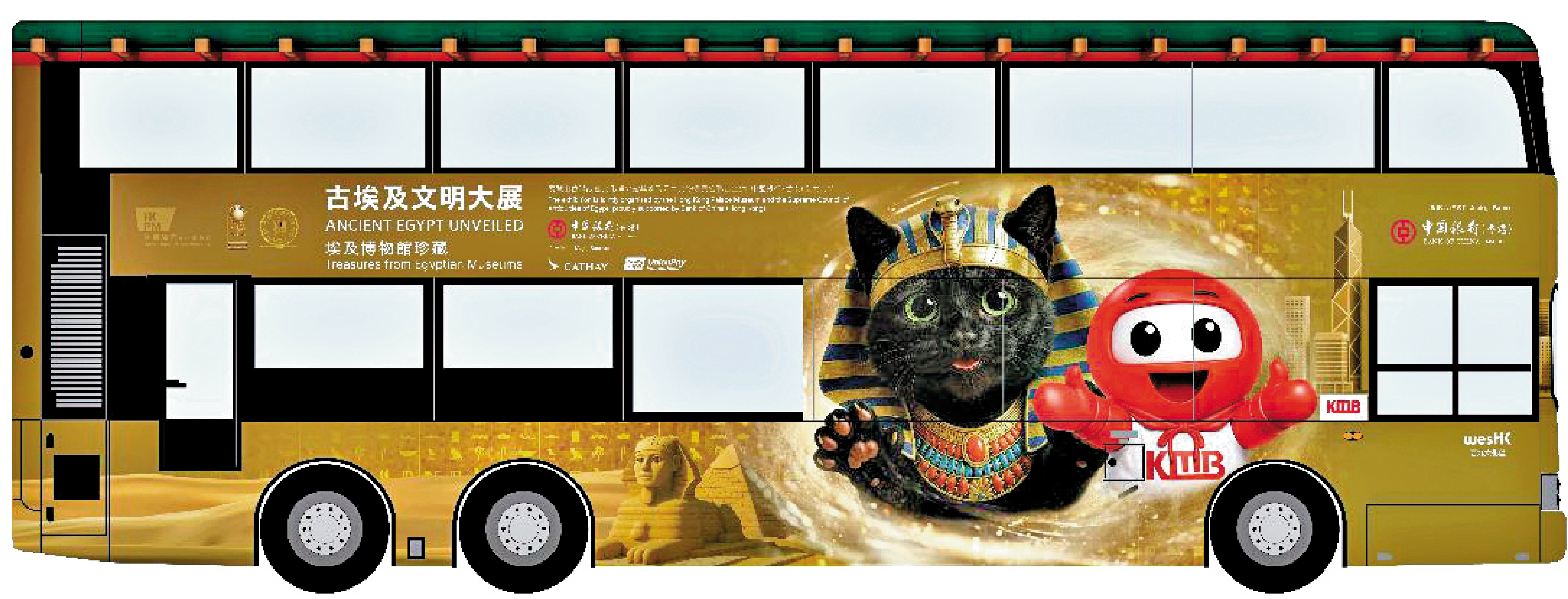 「九巴法老貓號」將於3月7日起正式投入服務,為期一個月,10輛主題巴士將分別行走於途經西九文化區的路線,包括「九巴遊香港」HK1開篷巴士、上月開辦連接西九文化區的「寵物巴士團」、W4[高鐵(西九龍站)往返尖沙咀(循環線)]及296D[尚德往返九龍站]。「九巴法老貓號」披上古埃及主題車身設計,除了生動展現兩位可愛小主角「九巴仔」與「法老貓」,更融入金字塔、藍色河馬、獅身人面像及聖書體符號等文化元素。
