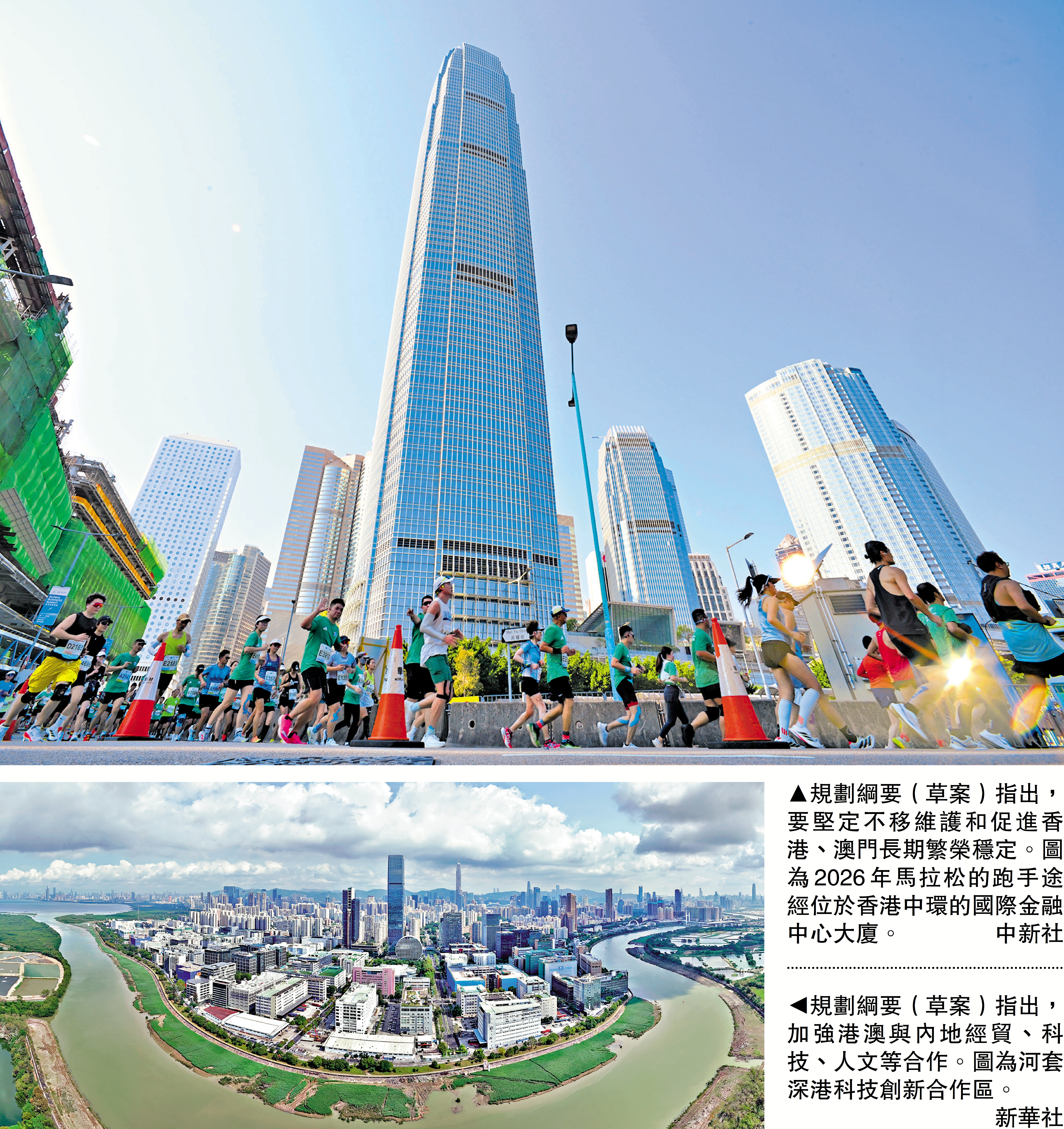 規劃綱要(草案)指出,要堅定不移維護和促進香港、澳門長期繁榮穩定。堅定不移貫徹「一國兩制」、「港人治港」、「澳人治澳」、高度自治方針,落實「愛國者治港」、「愛國者治澳」原則,提升港澳依法治理效能,促進港澳經濟社會發展,發揮港澳背靠祖國、聯通世界獨特優勢和重要作用。