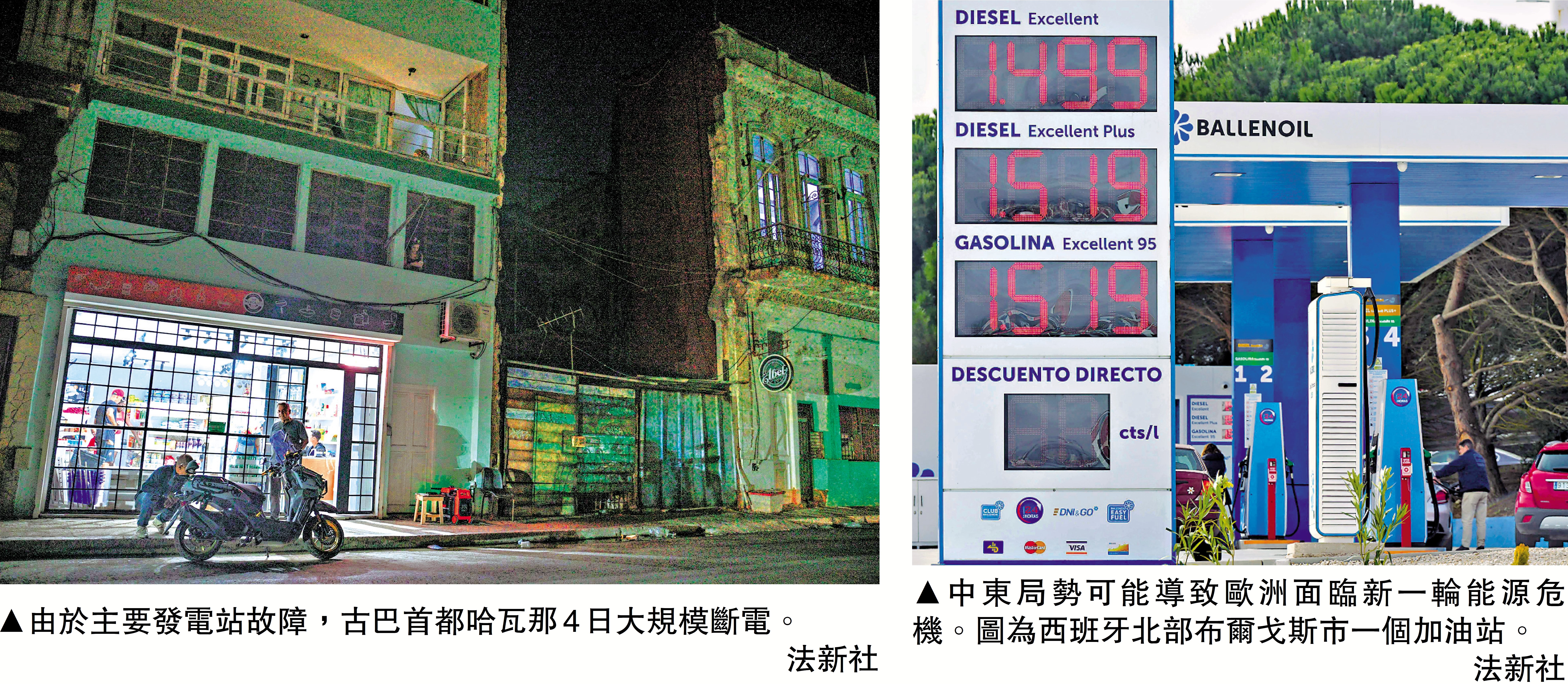 另外,古巴政府4日證實,由於主要發電站故障,包括首都哈瓦那在內的全國三分之二地區陷入斷電。因美國長期制裁,古巴電力系統脆弱。今年1月美國軍事入侵委內瑞拉,並實施石油禁運,導致供應古巴燃料供應停滯,部分地區每天停電長達20小時已成常態。古巴政府已採取暫停柴油銷售、實施汽油配給、減少醫院服務等措施,應對能源危機。