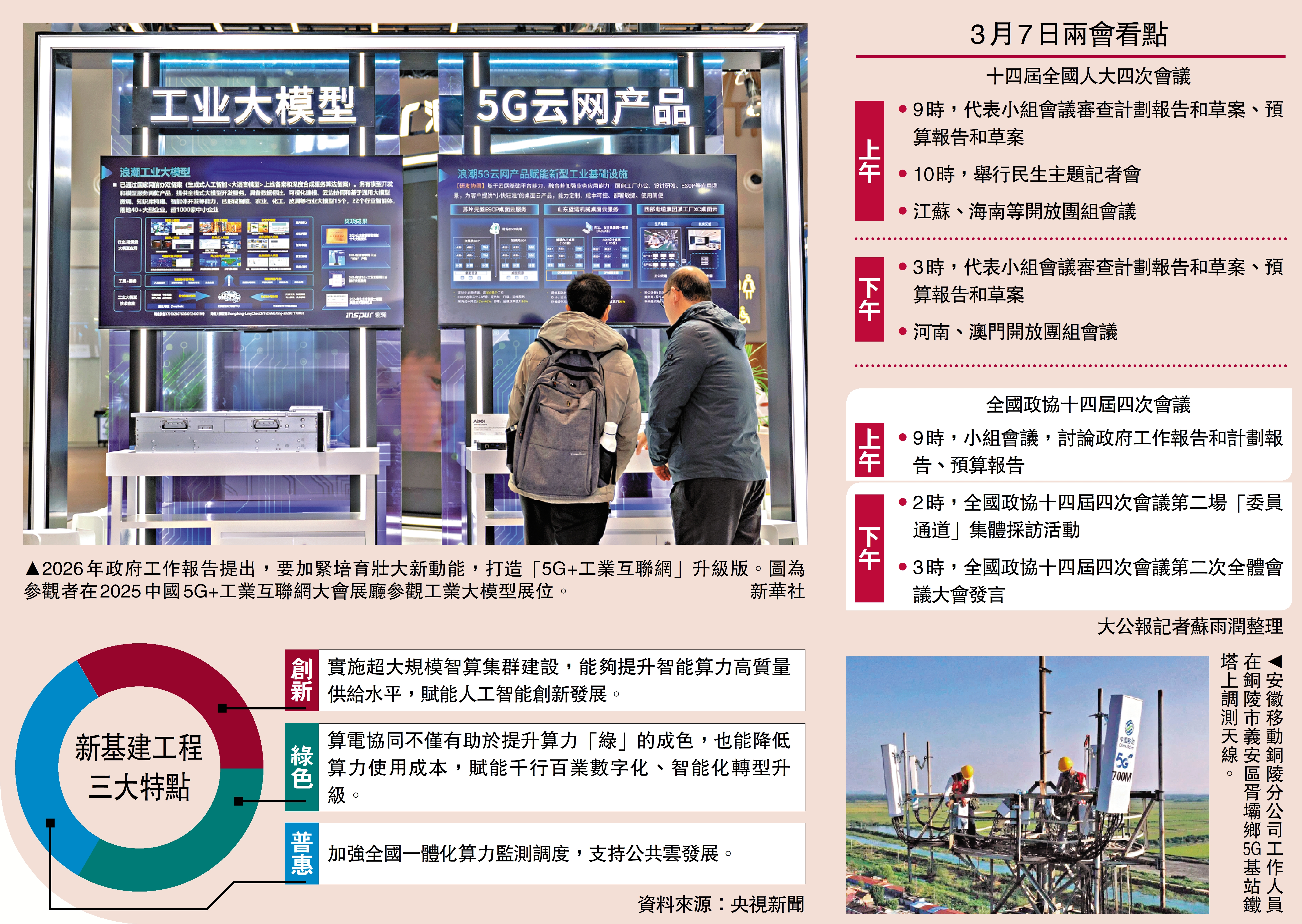 【大公報訊】綜合新華社、央視新聞報道:在「打造智能經濟新形態」方面,2026年政府工作報告中提出,「實施超大規模智算集群、算電協同等新基建工程」,加強全國一體化算力監測調度,支持公共雲發展。加快發展衛星互聯網。打造「5G+工業互聯網」升級版。
