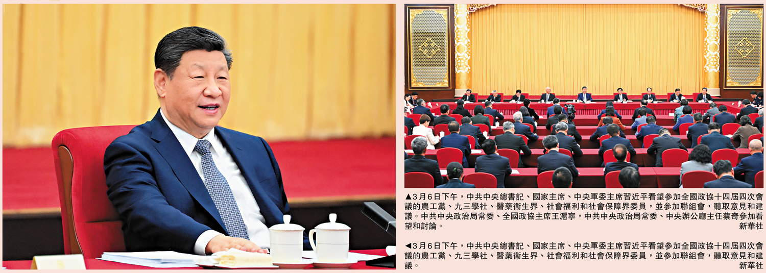 中共中央總書記、國家主席、中央軍委主席習近平6日下午看望了參加全國政協十四屆四次會議的農工黨、九三學社、醫藥衞生界、社會福利和社會保障界委員,並參加聯組會,聽取意見和建議。他強調,到2035年建成健康中國是中共中央作出的一項戰略決策,「十五五」是實現這一目標的關鍵時期,必須統籌謀劃、加緊推進,力求取得決定性進展。