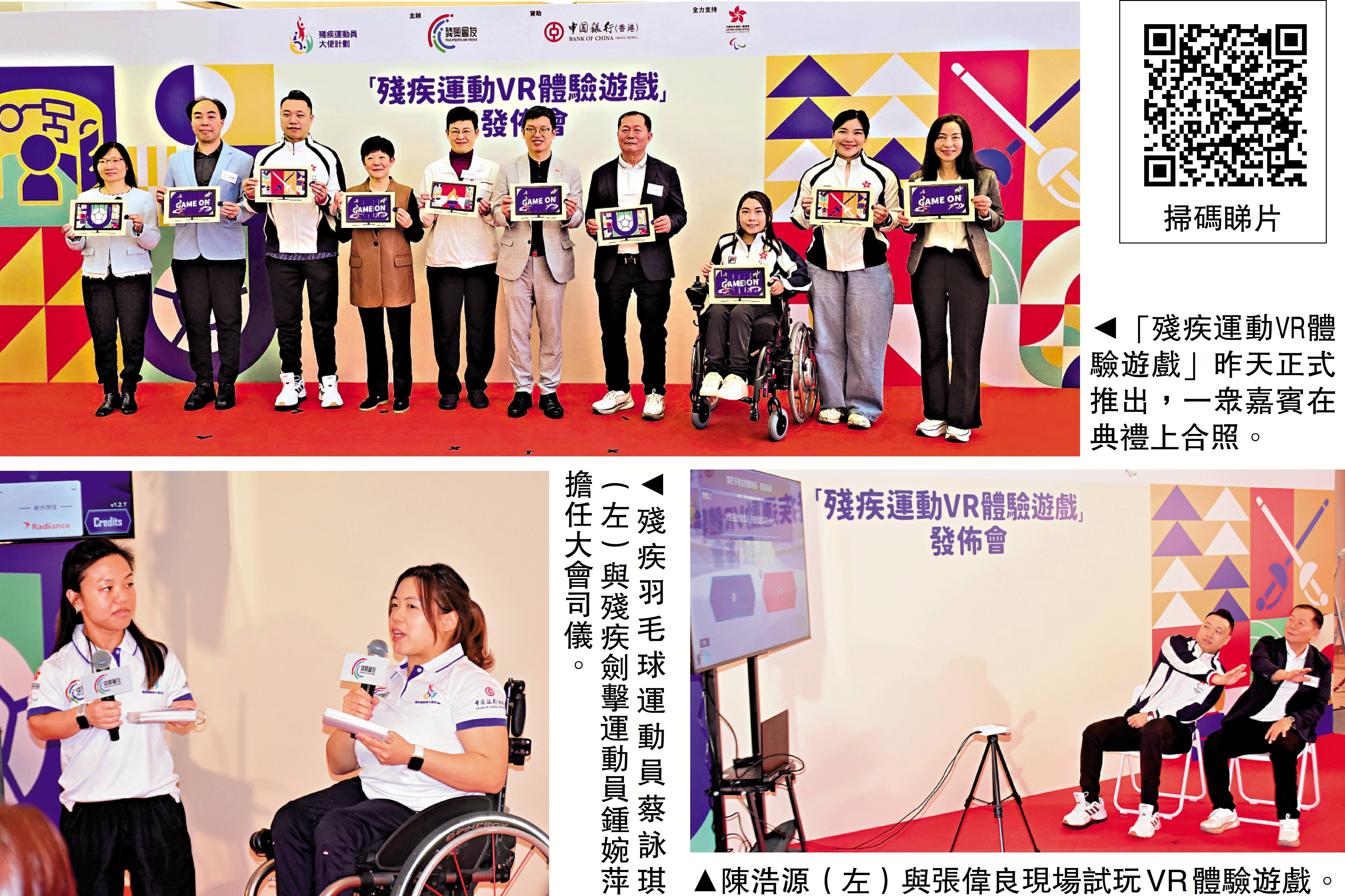 由殘奧會友主辦、中國銀行(香港)資助的全港首創「殘疾運動 VR 體驗遊戲」昨天正式推出,並於奧海城舉行發布會。發布會上,一眾主禮嘉賓聯同殘奧會友委員會成員及殘疾運動員大使,包括硬地滾球運動員何宛淇、輪椅劍擊運動員余翠怡、殘疾羽毛球運動員陳浩源,以及鍾婉萍和蔡詠琪等,一同為體驗遊戲揭開序幕。市民可於本周末親臨奧海城2期地下活動大堂,挑戰試玩硬地滾球和殘疾劍擊運動的VR遊戲,以及感受猶如置身大型賽事開幕禮的現場氣氛。\大公報記者 張銳(文、圖)