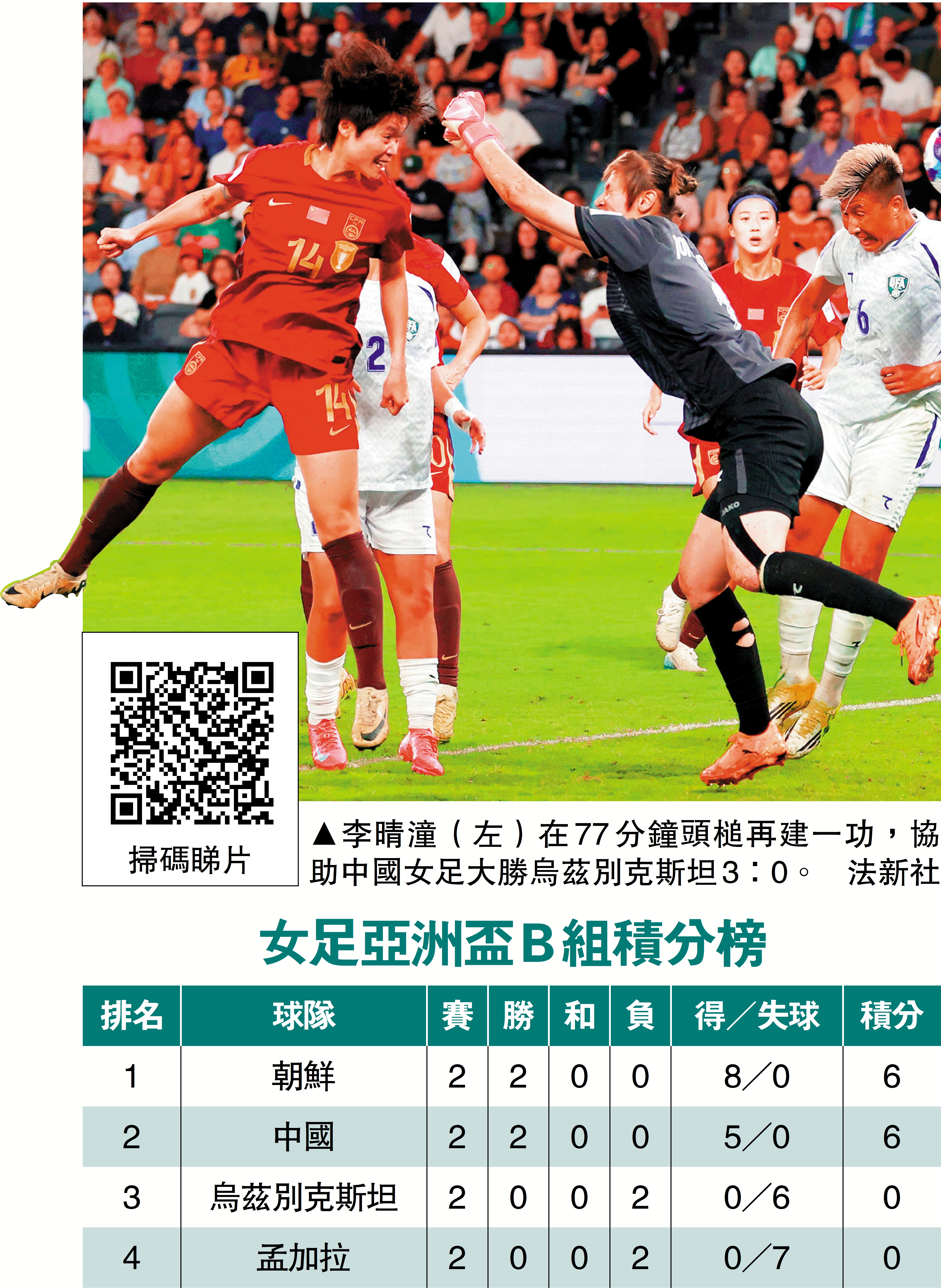 【大公報訊】爭取衛冕的中國女足6日在亞洲盃B組第2輪賽事上,憑邵子欽先拔頭籌及李晴潼「梅開二度」,以3:0輕取烏茲別克斯坦,並與朝鮮同樣以2戰2勝提前出線8強,兩隊將於9日下午5時最後一輪交鋒,爭取首名出線避開於8強碰上東道主澳洲或韓國。